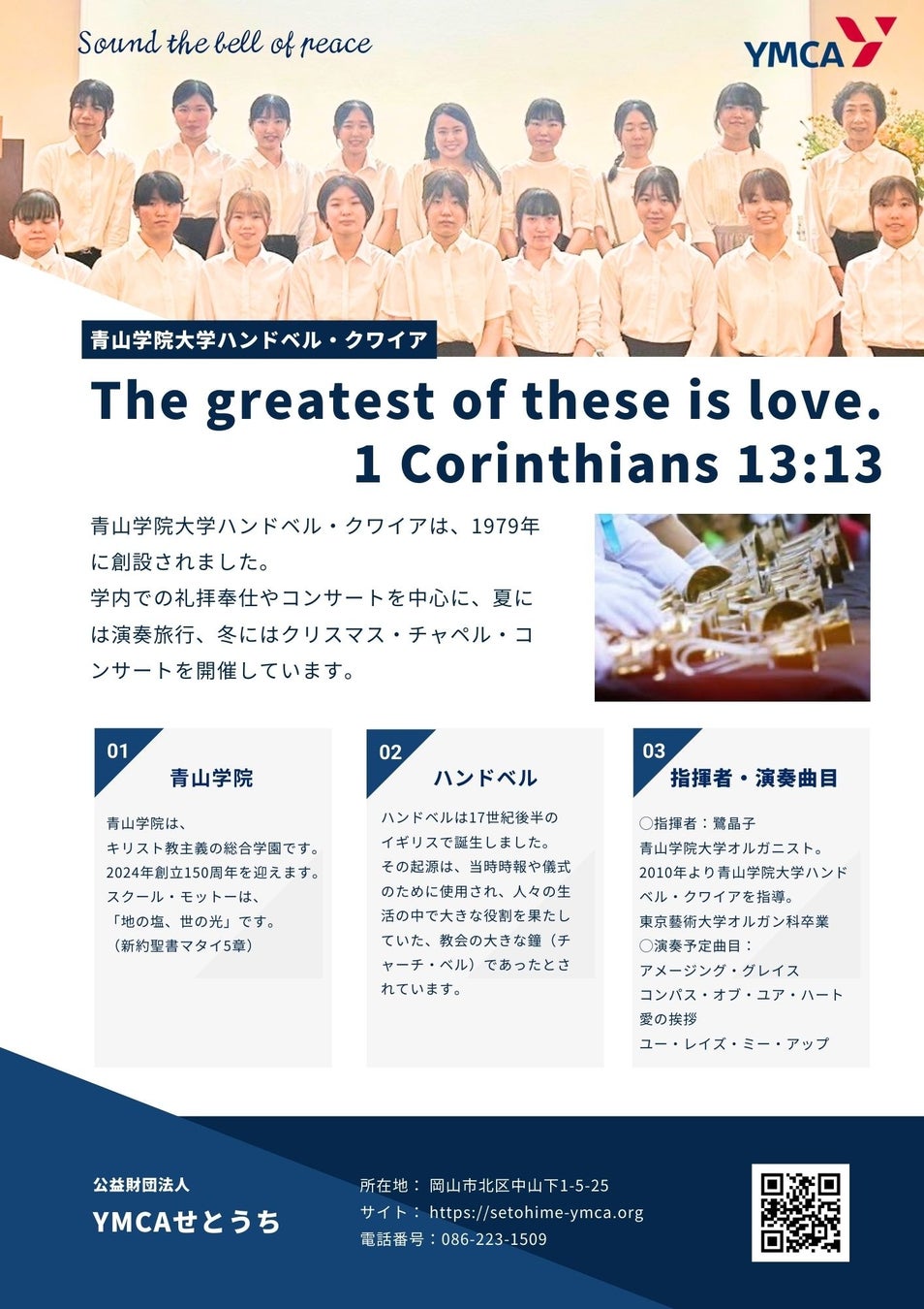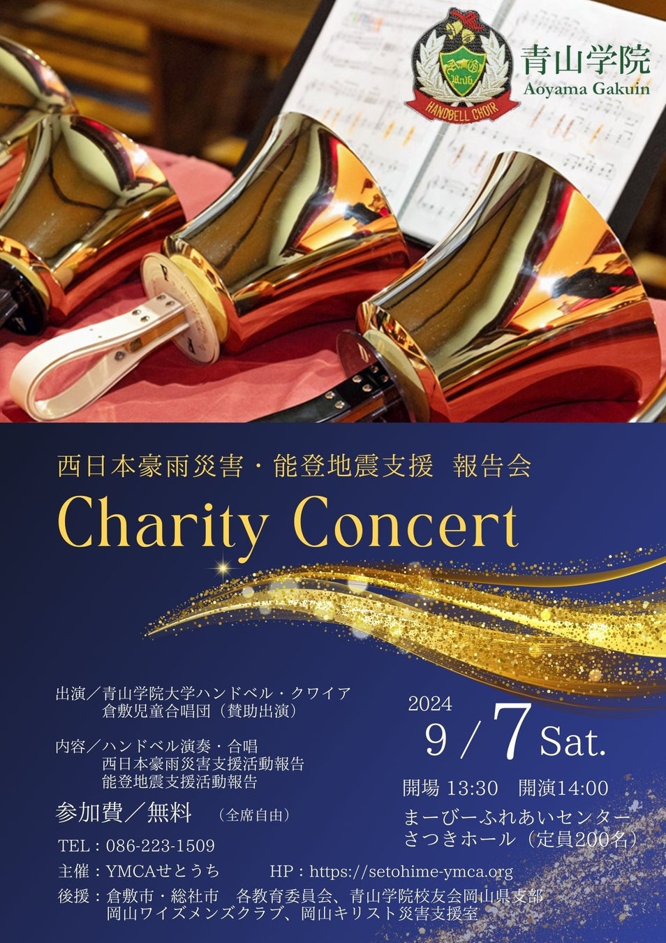 9月7日㈯、倉敷市の真備町に位置する「まーびーふれあいセンター」にて、西日本豪雨災害・能登地震支援 チャリティーコンサートを開催します。出演は、青山学院大学ハンドベル・クワイアと倉敷児童合唱団です。天使の鐘と歌声に耳を傾け、みなで希望の時を過ごしましょう。