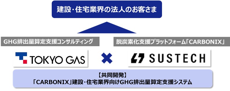 東京ガス株式会社(社長:内田 高史、以下「東京ガス」)と株式会社Sustech(代表取締役:丹野 裕介・飯田祐一郎、以下「Sustech」)は、このたび、Sustechの運営する脱炭素化支援プラットフォーム「CARBONIX」のオプション機能として、建設・住宅業界向けGHG排出量算定支援システムを共同開発しました*1。東京ガスのコンサルティングと、SustechのCARBONIXを組み合わせた、建設・住宅業界向け温室効果ガス(以下「GHG」)排出量算定サービス(以下「本サービス」)を2023年4月1日より開始します。