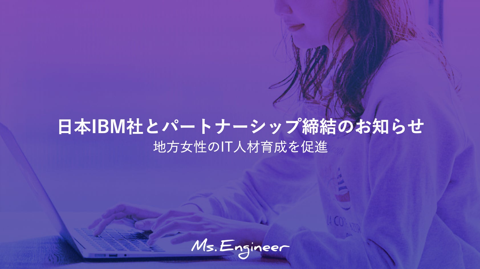 女性のためのコーディングブートキャンプ「Ms.Engineer(ミズエンジニア)」を運営するMs.Engineer株式会社(本社:東京都千代田区、代表取締役:やまざきひとみ、以下、Ms.Engineer)と日本アイ・ビー・エム株式会社(本社:東京都中央区、代表取締役社長:山口明夫、以下 日本IBM)は、地方における女性のIT人材育成を推進するため、パートナーシップを締結しました。これにより、日本IBMとMs.Engineerは、日本IBMのグループ会社である日本アイ・ビー・エム デジタルサービス株式会社(以下、IJDS)が主体として全国7カ所で展開する「IBM地域DXセンター」を中心に、地方における女性エンジニアの育成および就職を協力して支援していきます。