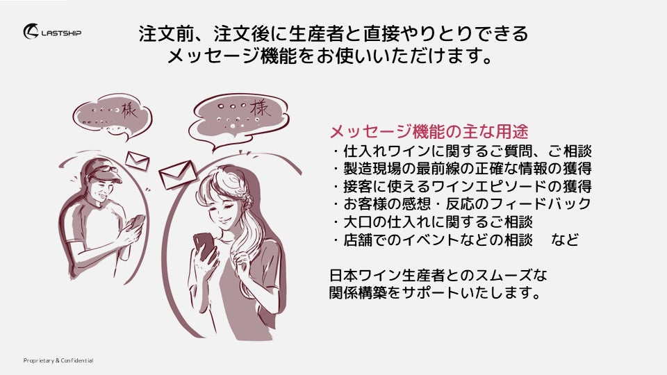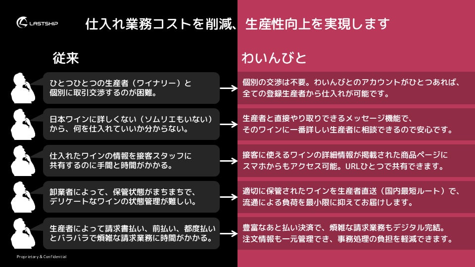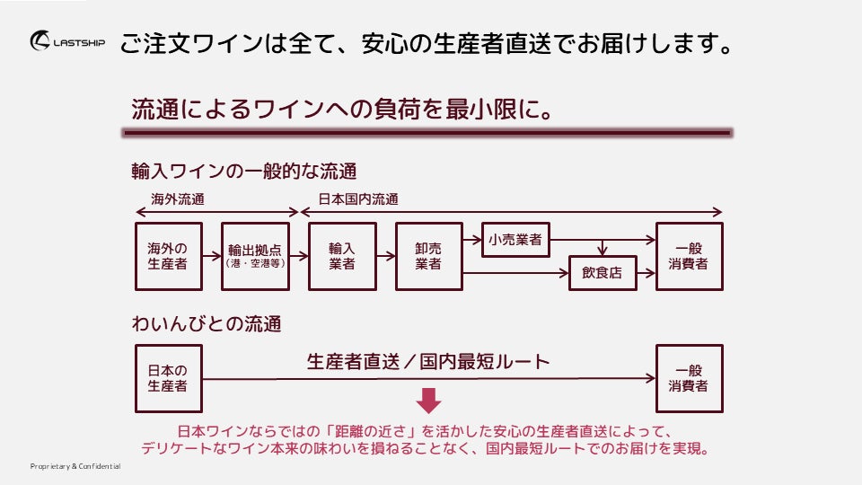 LASTSHIPは、日本ワイン専門のモール型ECプラットフォーム「わいんびと」を通じて、日本各地の日本ワインの造り手と飲み手が繋がる場を提供しています。これまで主に一般の生活者向けにサービスを提供してまいりましたが、この度、日本全国の料飲店様向けにわいんびとのサービス提供を開始いたします。