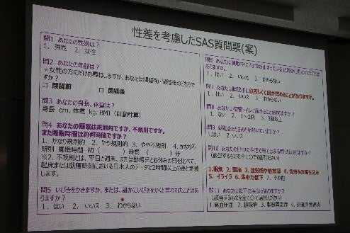 今回のシンポジウムで池上先生は、現在使用されているスクリーニングである「STOP-BANG質問票」と「ベルリン質問票」の結果を比較した上で、より臨床に即しかつ性差を考慮した質問票案を紹介しました。