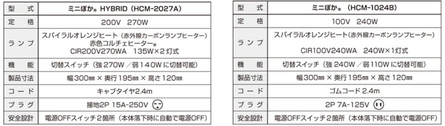 200V仕様の「ミニぽか® HYBRID」は、「スパイラルオレンジヒート」と「赤色コルチェヒーター®」を組み合わせた構造を採用しています。