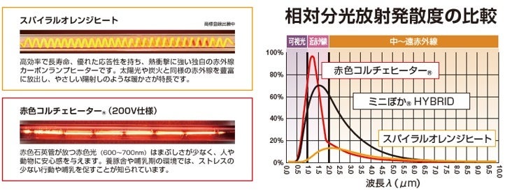 異なる赤外線波長をバランスよく活用することで、深部加温効果と視覚的な暖かさを両立し、動物が快適に暖を取れる環境を実現します。