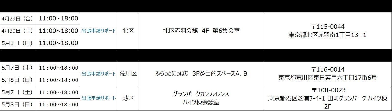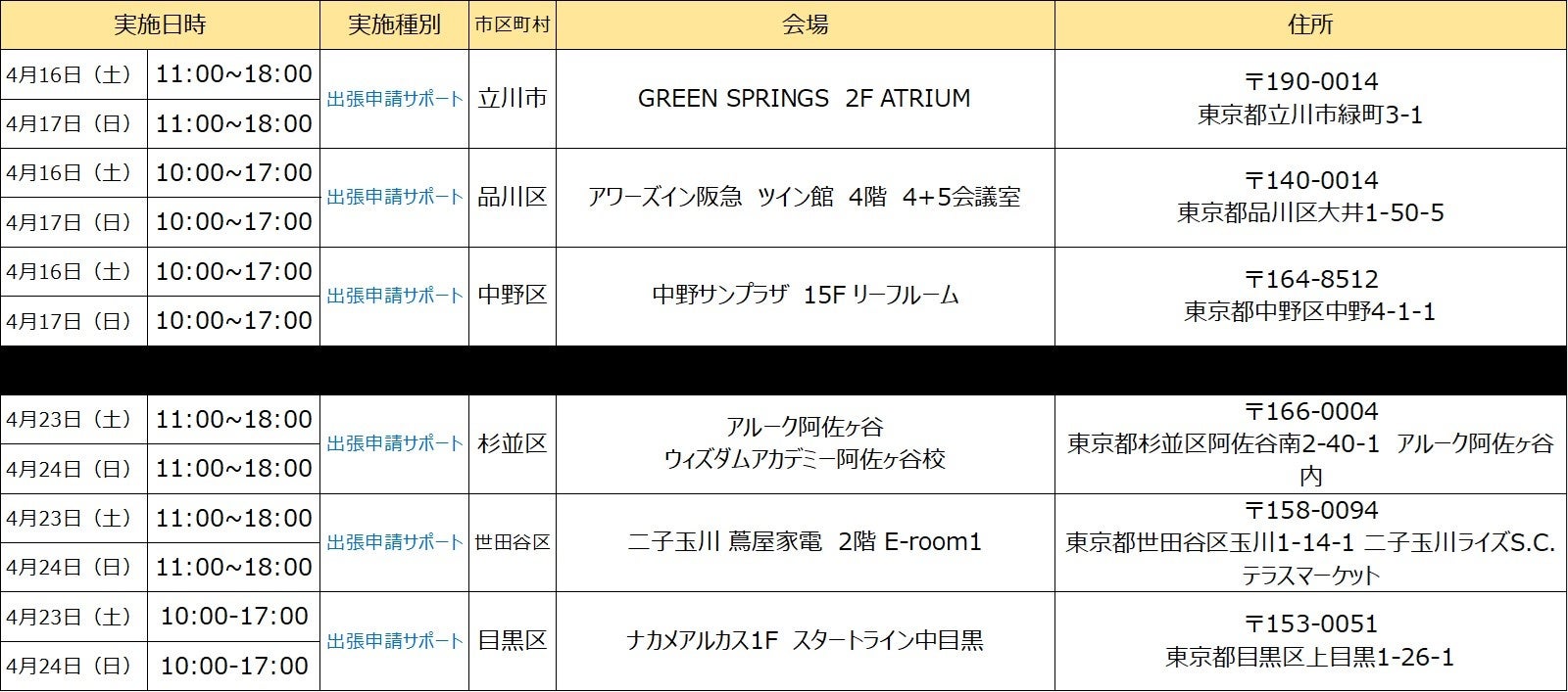 ※開催場所の調整状況や新型コロナウィルスの感染状況等により、「出張申請受付」及び「出張申請サポート」の開催を中止・延期、または実施内容が変更となる可能性がございます。