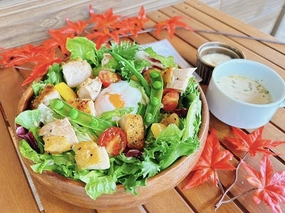 千葉県の地鶏(錦爽鳥)を液体塩こうじに漬け込み、柔らかくジューシーに仕上げ、彩り豊かな野菜と一緒に召し上がるボリューム満点のメニューに。ショウガドレッシングをかけて、ごはんと具材を混ぜてお召し上がりいただきます。カフェリエ人気のメニューに、液体塩こうじで程よく漬け込まれた錦爽鶏のジューシーさが加わった、食べ応えあるメニューに仕上げました。
