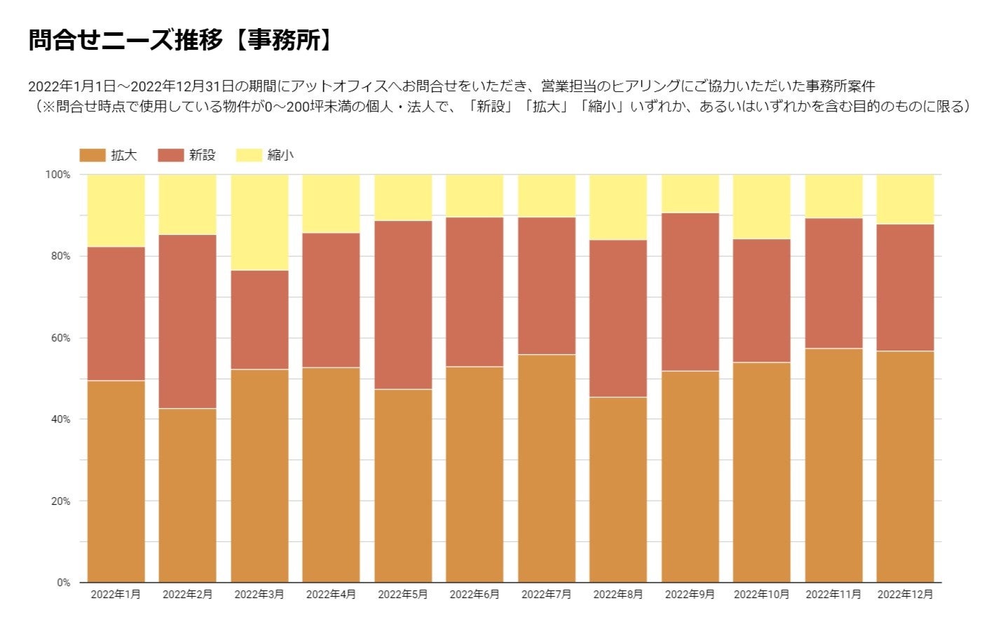 2022年の中小ベンチャー・スタートアップ企業のオフィスニーズとしては、3月を除き、「拡大」「新設」が全体の8割を超える結果となりました。