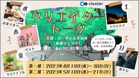 一般社団法人関西イノベーションセンター(大阪府大阪市、代表:早乙女 実(そうとめみのる)、以下当社団)、クラスター株式会社(東京都品川区、代表:加藤 直人(かとうなおと)、以下クラスター)、株式会社BitStar(東京都渋谷区、代表:渡邉 拓(わたなべたく)、以下BitStar)、および株式会社ClaN Entertainment(東京都港区、代表:大井 基行(おおいもとゆき)、以下ClaN)、およびTokyo Marunouchi Innovation Platform(以下、TMIP)は、クラスターのメタバースプラットフォーム『cluster』上で三菱地所株式会社が運営する「バーチャル丸の内」の仲通りエリアにおいて、クリエイターと連携した日替わりのトーク企画を開催します。