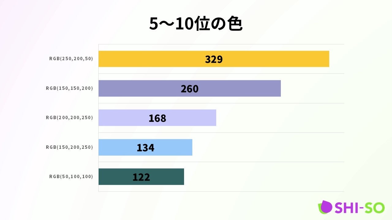 調査方法はPDF資料の各ページで使用されている色をRGB値で表し、結果をまとめやすくするためRGBの各値を50単位で丸めたものの上位5色です。