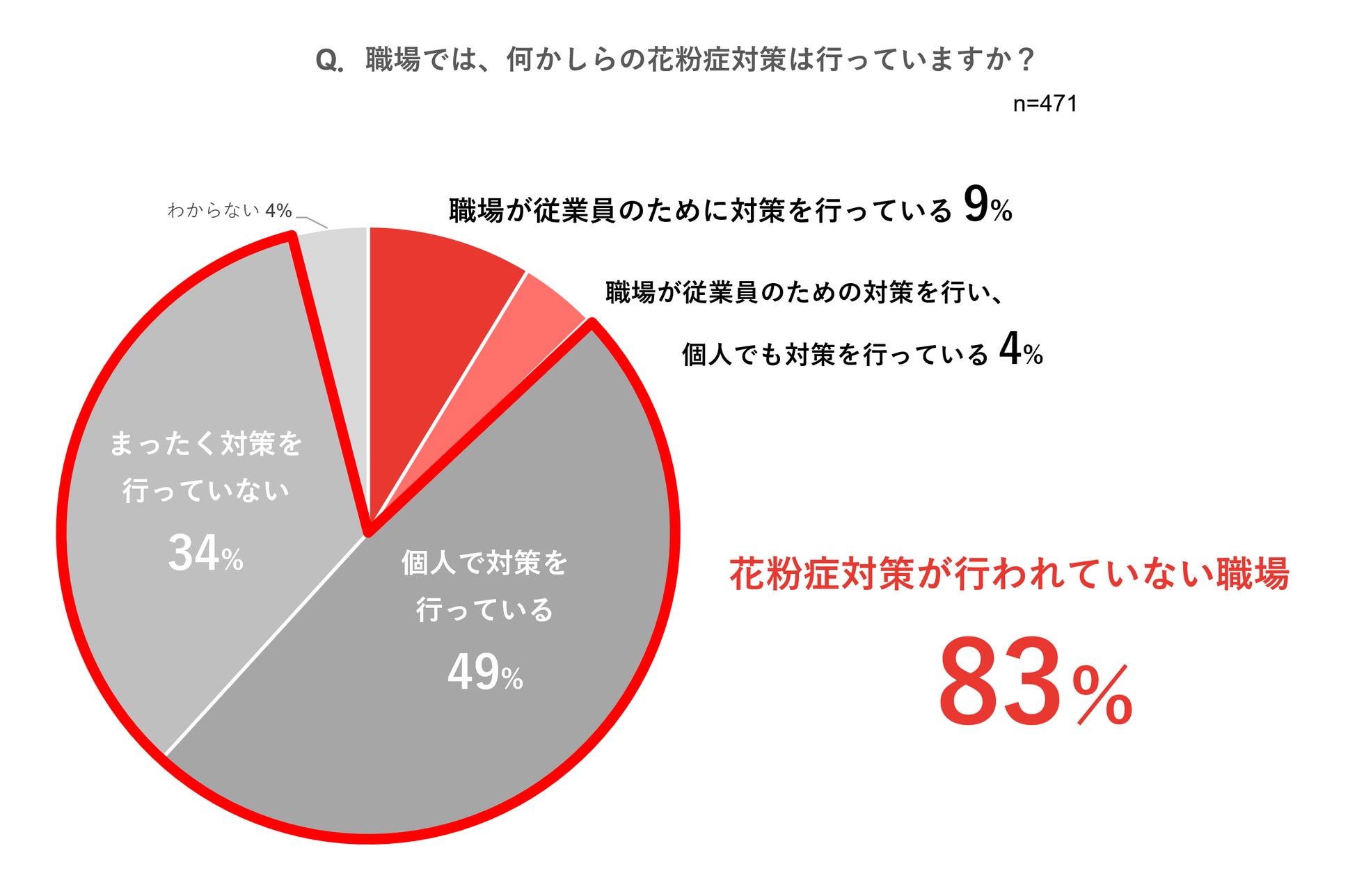 「花粉症が仕事のパフォーマンス低下に繋がると感じるか」という質問に対して、約9割が「パフォーマンス低下につながる」と回答。そのような中、職場における従業員のための対策状況については「職場が従業員のために対策を行っている」が9%、「職場が従業員のための対策を行い、個人でも対策を行っている」が4%と、約1割の職場でしか明確な花粉症対策が講じられていないという結果になりました。