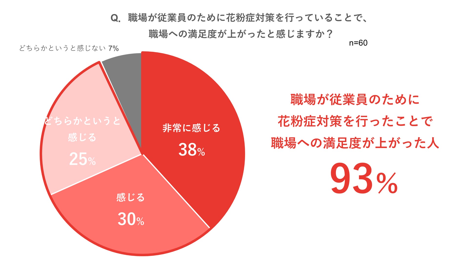花粉症対策を行っていることで「職場への満足度が上がった」と回答した人は9割以上