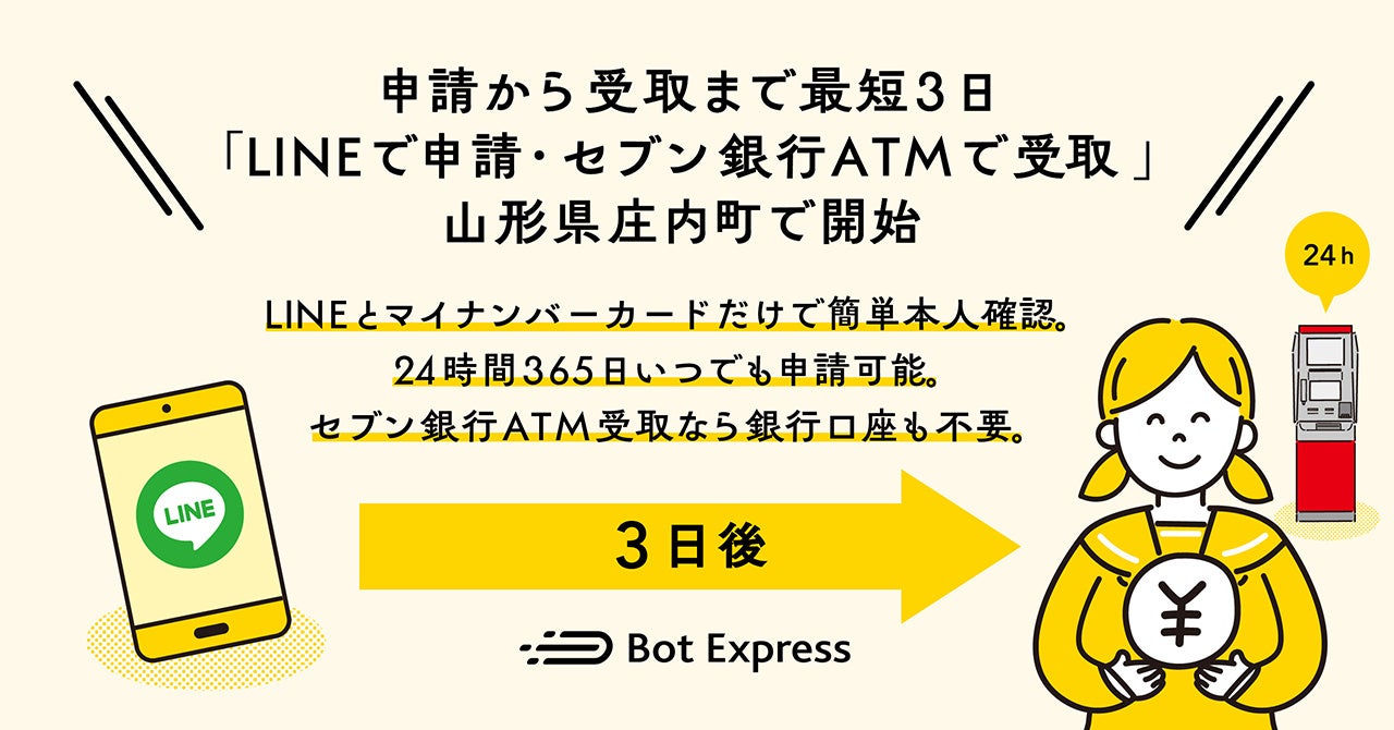 ほとんどの住民が、今、すぐに利用できるスマホ市役所「GovTech Express」を提供する株式会社Bot Express(本社:東京都港区、代表取締役:中嶋 一樹、以下 Bot Express)は、山形県庄内町(町長:富樫 透)がGovTech Expressを活用し、子育て世帯支援事業として実施する支援金において、庄内町LINE公式アカウントから申請を行うことができる「LINEで申請・セブン銀行ATMで受取」を開始したことをお知らせいたします。