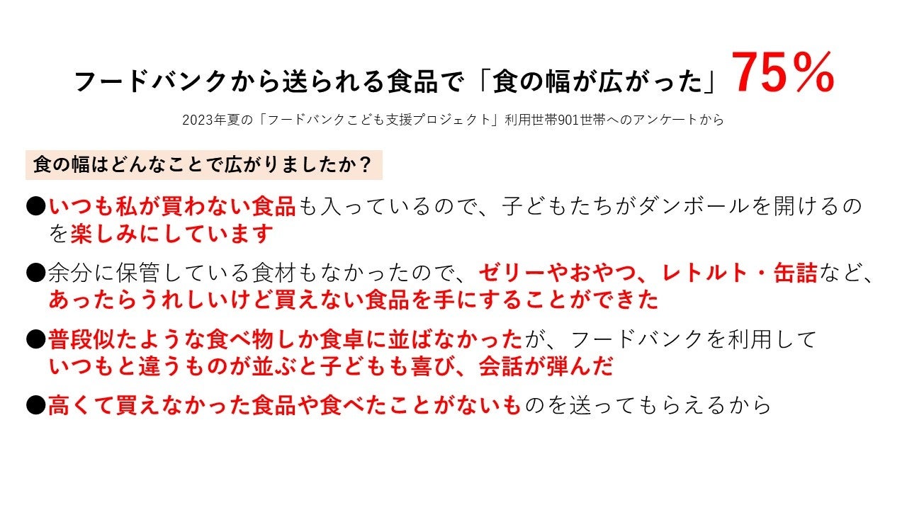 給食のない学校休暇中に子どものいる世帯へ食料支援を行う「フードバンクこども支援プロジェクト」の支援数は年を追って増加し、2023年度は2,743世帯と過去最多になりました。