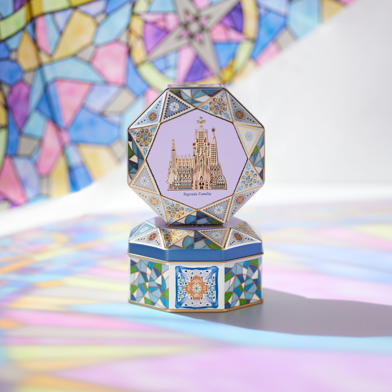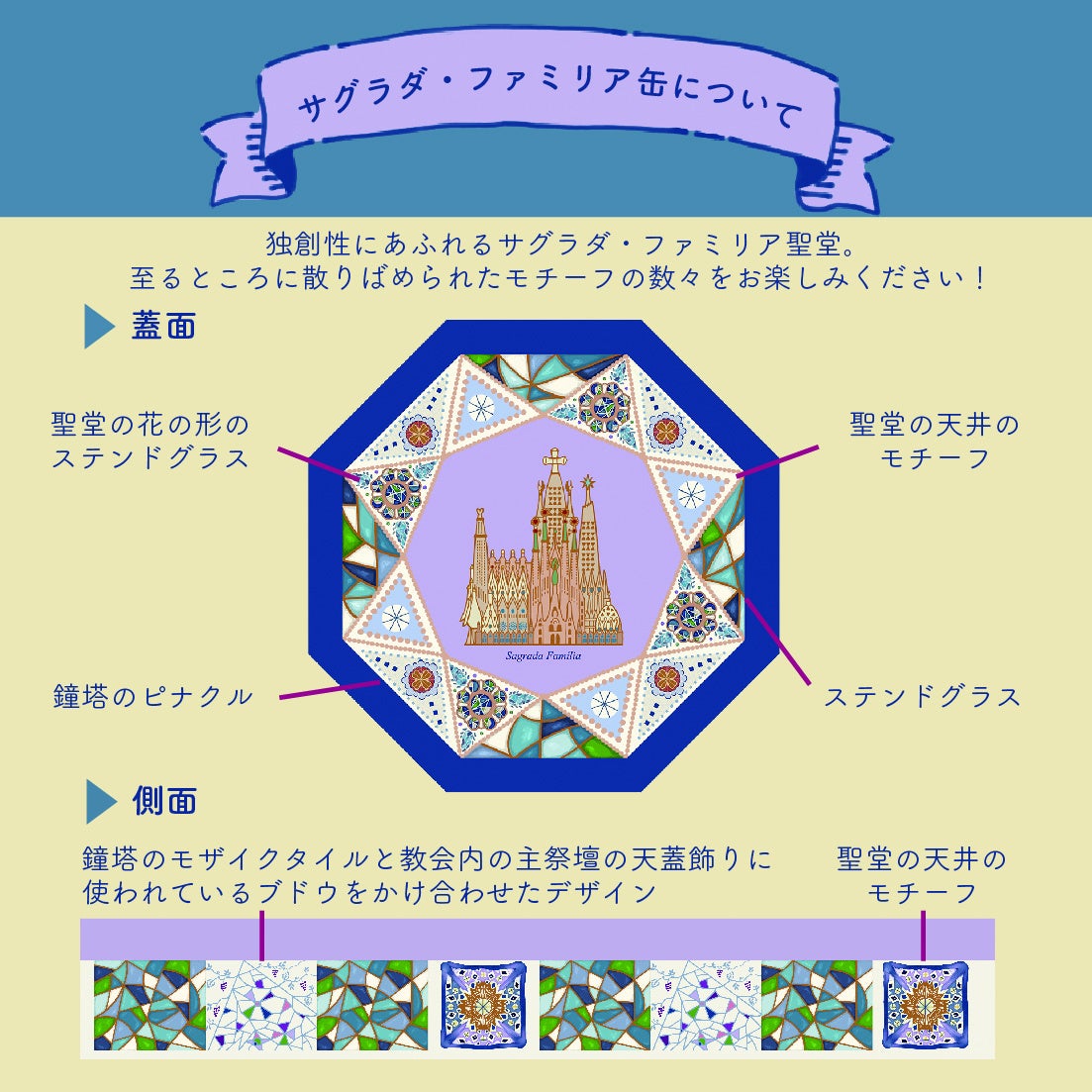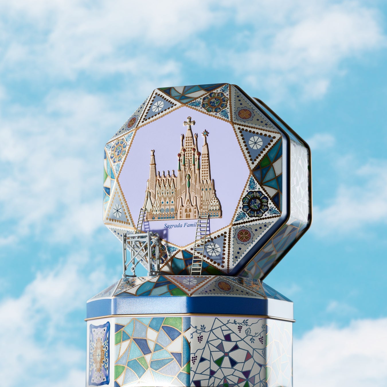 ダイヤモンドカットの缶で幾何学的なガウディの建築を表現した、サグラダ・ファミリア缶。サグラダ・ファミリア聖堂の花の形のステンドグラスや天井のモチーフ、鐘塔のピナクル、モザイクタイル、教会内の主祭壇の天井飾りに使われているブドウをかけ合わせたデザインなど、様々なモチーフが缶の至る所に描かれ、キラキラ輝きます。