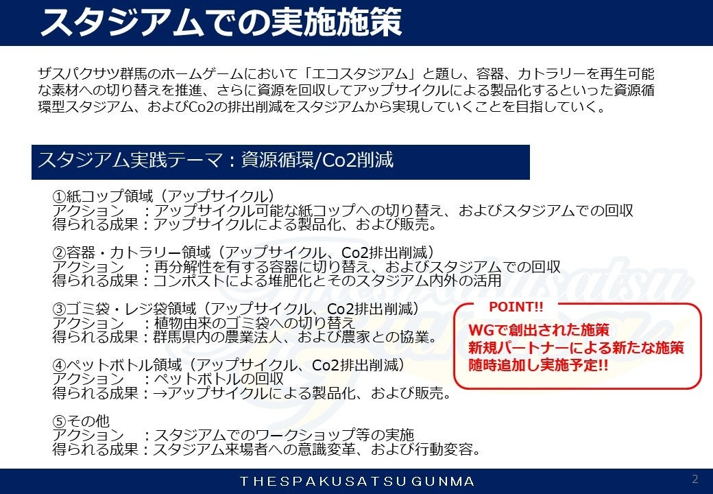 またスタジアムでの取り組みに加え、「ザスパの恩返しプロジェクト 発展パートナー」加入企業の皆様で構成するワーキンググループで創出された施策をスタジアム内外でも実施していくことも予定しています。