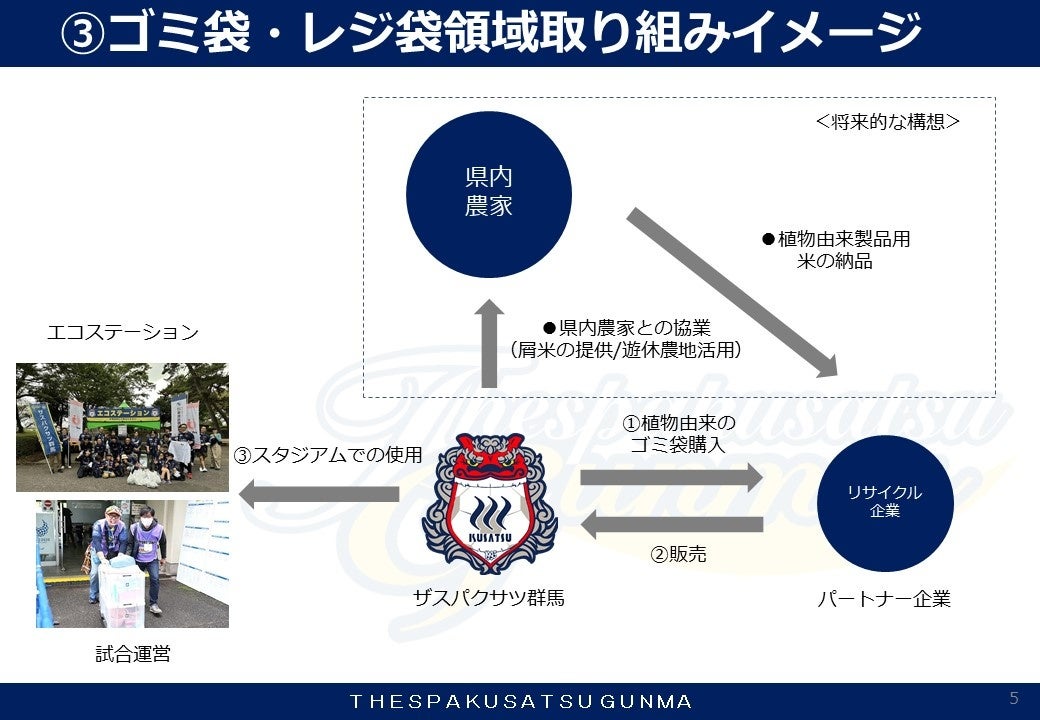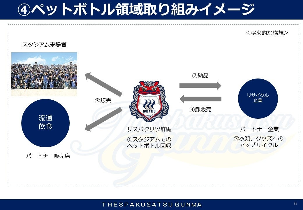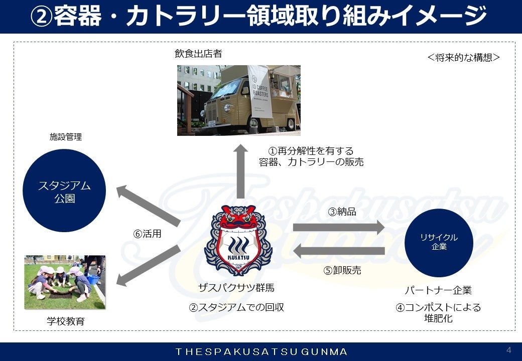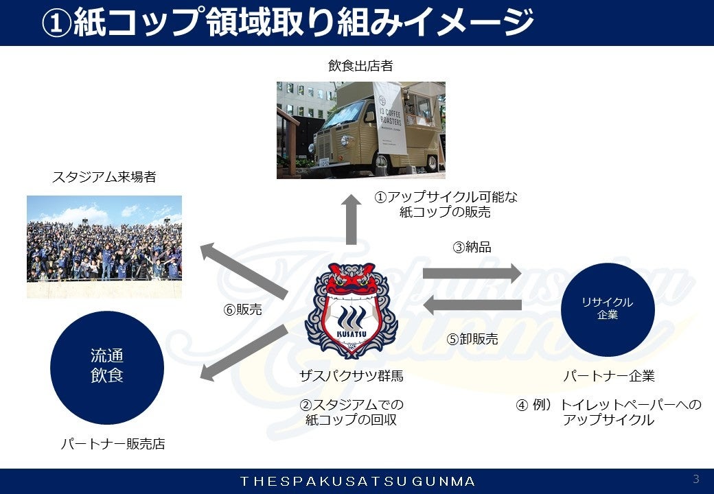 この度ザスパクサツ群馬では、2023シーズンのホームゲームにおいて「ザスパエコスタジアムプロジェクト」と題し、スタジアムで使用する容器や備品の再生可能な素材への切り替え推進、さらに資源を回収してアップサイクルによる再製品化といった資源循環システムの構築、およびCO2の排出削減をスタジアムから実現していくことを目指していきます。