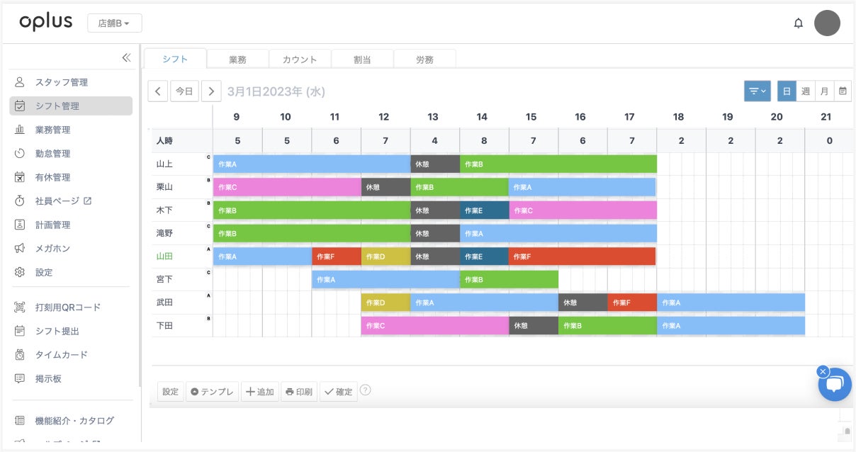 こうした機会損失や無駄な人件費の発生を防ぐため、「oplus」は週間・月間単位でスタッフの出勤・休暇を管理する他に、各スタッフに対して時間帯別に業務内容を割り当てた、1日単位のシフト管理・作成ができる「デイリーワークスケジュール」機能をリリースいたしました。