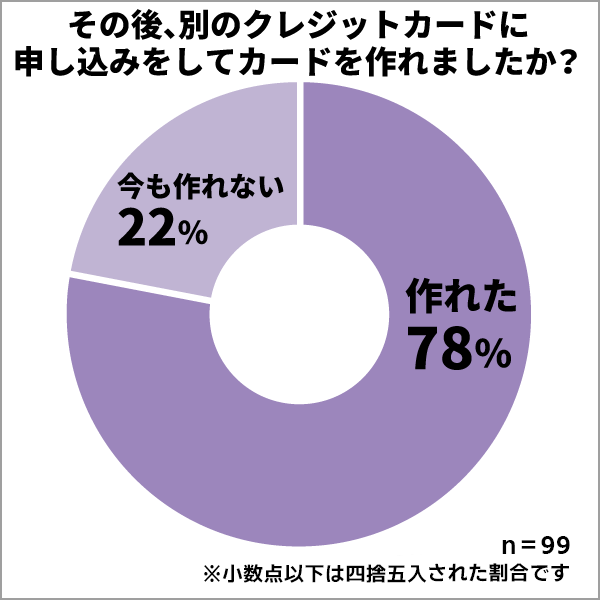 500人中クレジットカードの審査に落ちた経験があると回答した99人の方に、「クレジットカードの審査に落ちた後、別のクレジットカードに申し込みをしてカードを作れたか」聞いたところ、8割近くの方が別のクレジットカードを作れたと回答しています。