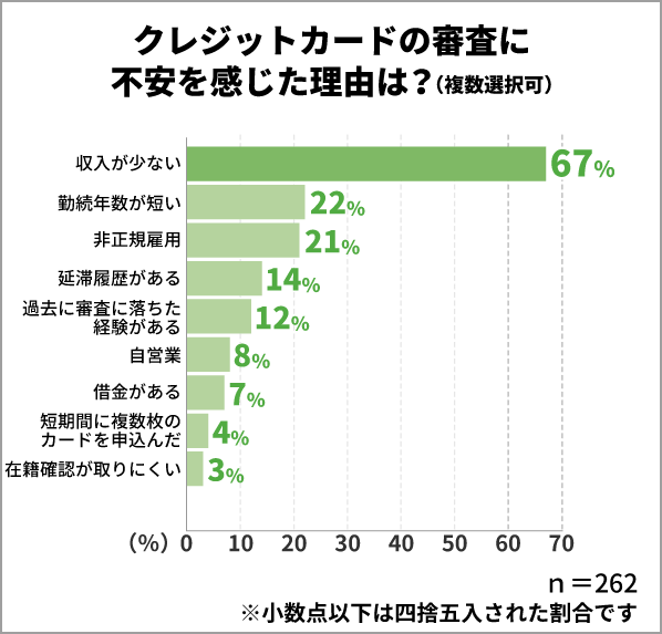 500名中「クレジットカードの審査に通るか不安を感じたことがある」と回答した262名に「不安を感じた理由」を聞いてみたところ、6割以上の方が「収入が少ないから審査に通らないのではないか?」と不安に思っていらっしゃいました。