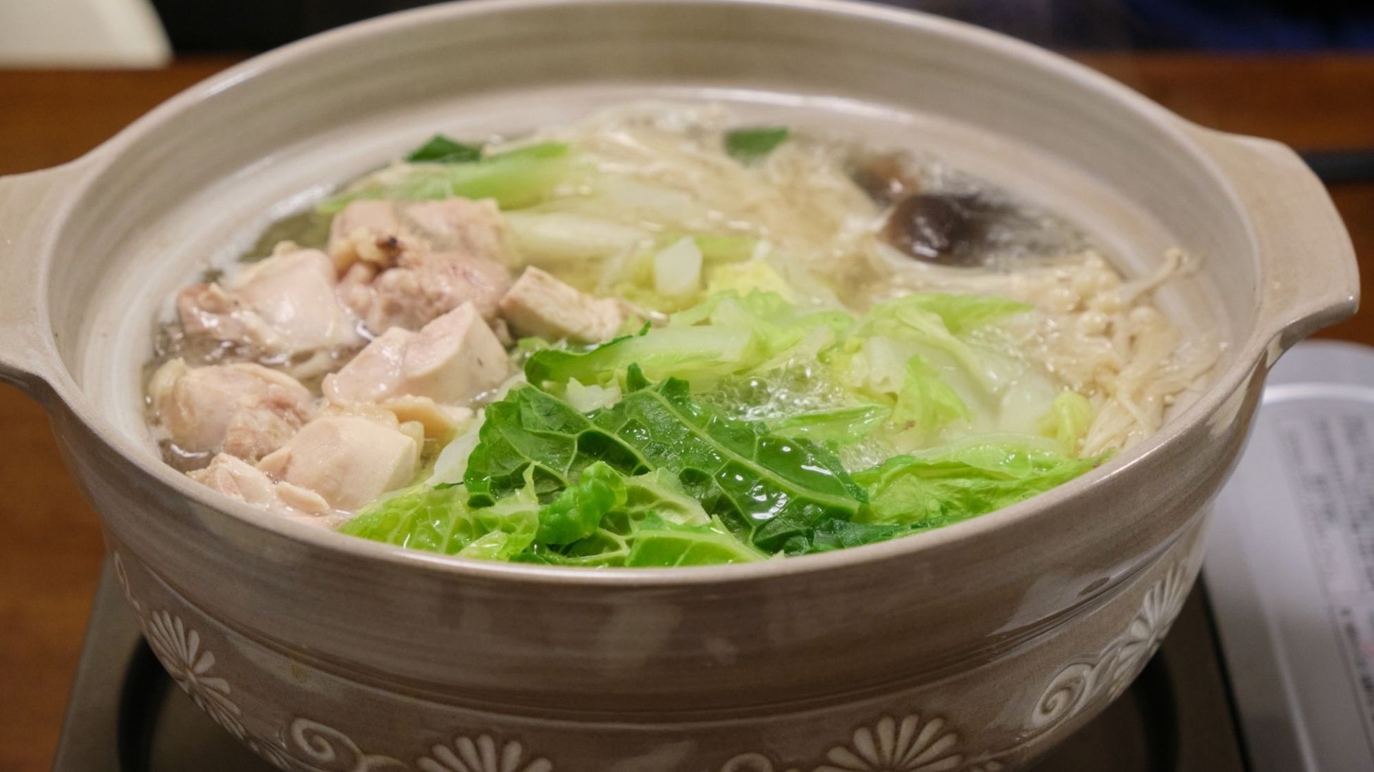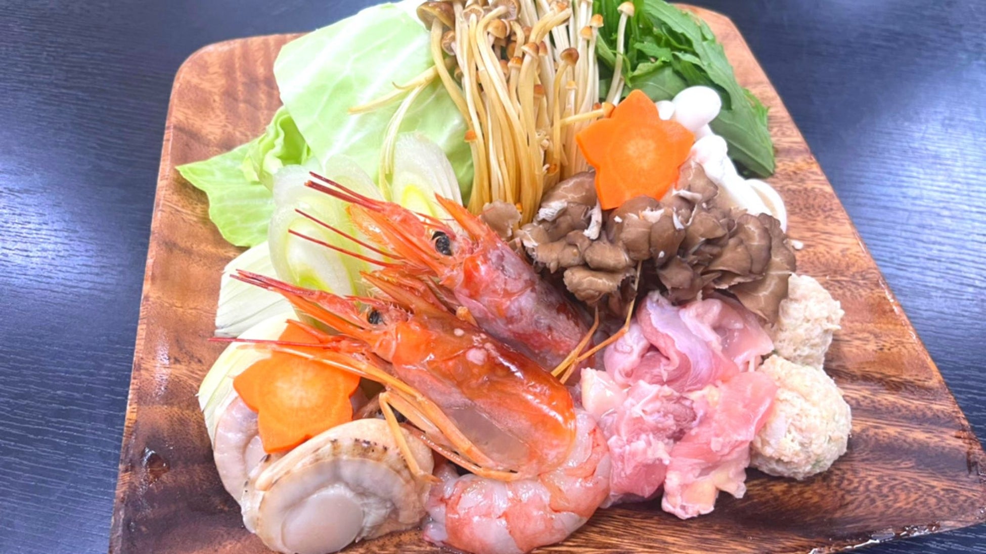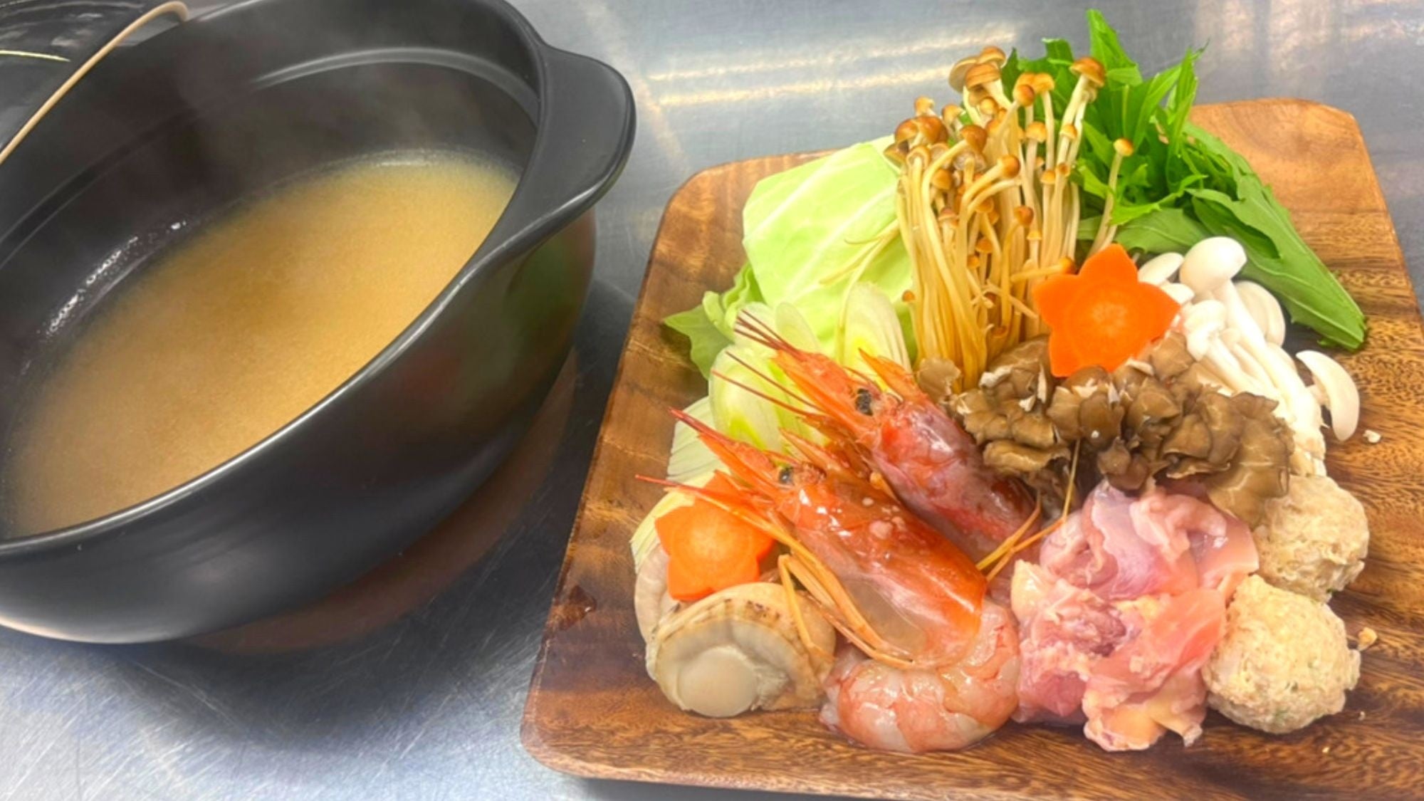 お鍋の内容は、地元産の季節のお野菜、きのこ、エビ、ホタテ、鶏、鶏団子、〆はラーメンです。