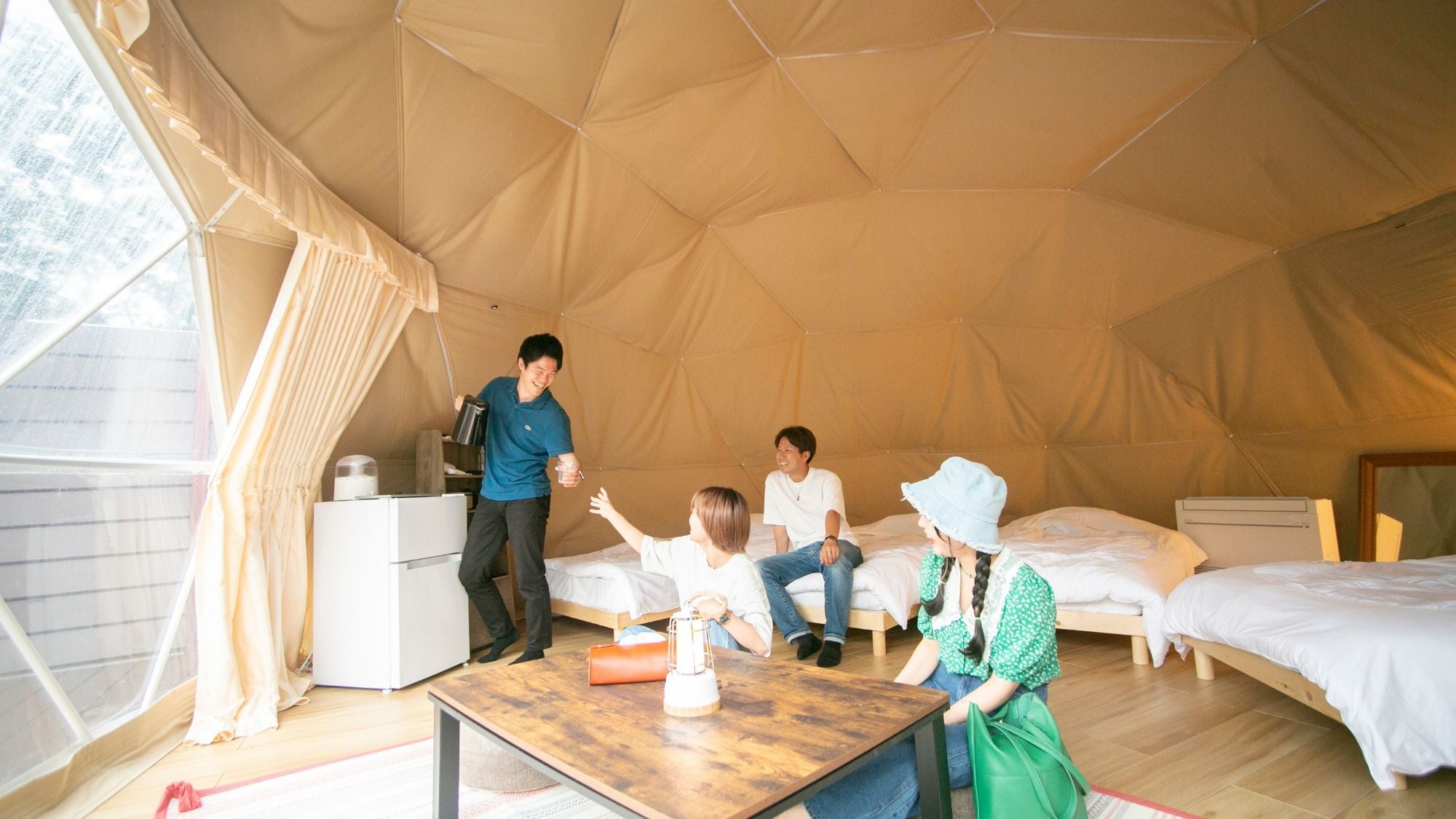 最大4名が宿泊できる直径6mのラグジュアリードームテントはスイスアルプスの山岳リゾートや、砂漠地のグランピング施設で採用されており、暑い夏でも寒い冬でも適応できることが実証されています。2重構造の室内はエアコンも完備し、オールシーズン快適にお過ごしいただけます。