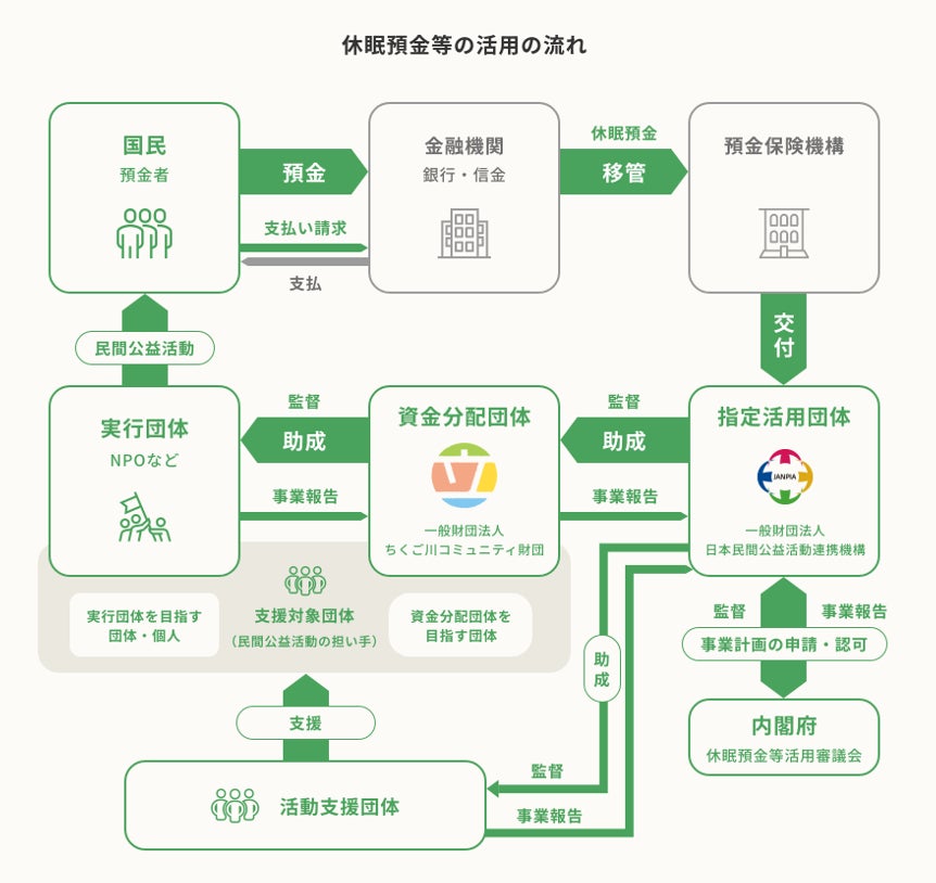 「民間公益活動を促進するための休眠預金等に係る資金の活用に関する法律」(休眠預金等活用法)に基づき、2009年1月1日以降の取引から10年以上、その後の取引のない預金等(休眠預金等)を社会課題の解決や民間公益活動の促進のために活用する制度が2019年度から始まりました。