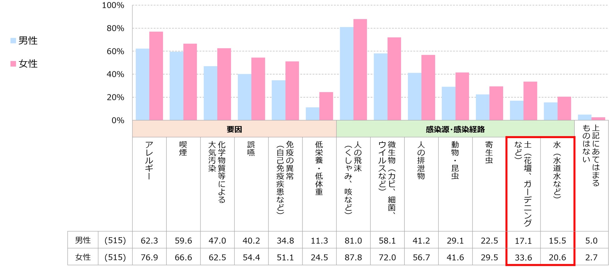 肺NTM症の感染経路と考えられている「土(花壇、ガーデニングなど)」は、男性17.1%、女性33.6%、「水(水道水など)」は、男性15.5%、女性20.6%と認知されている割合が低かった。