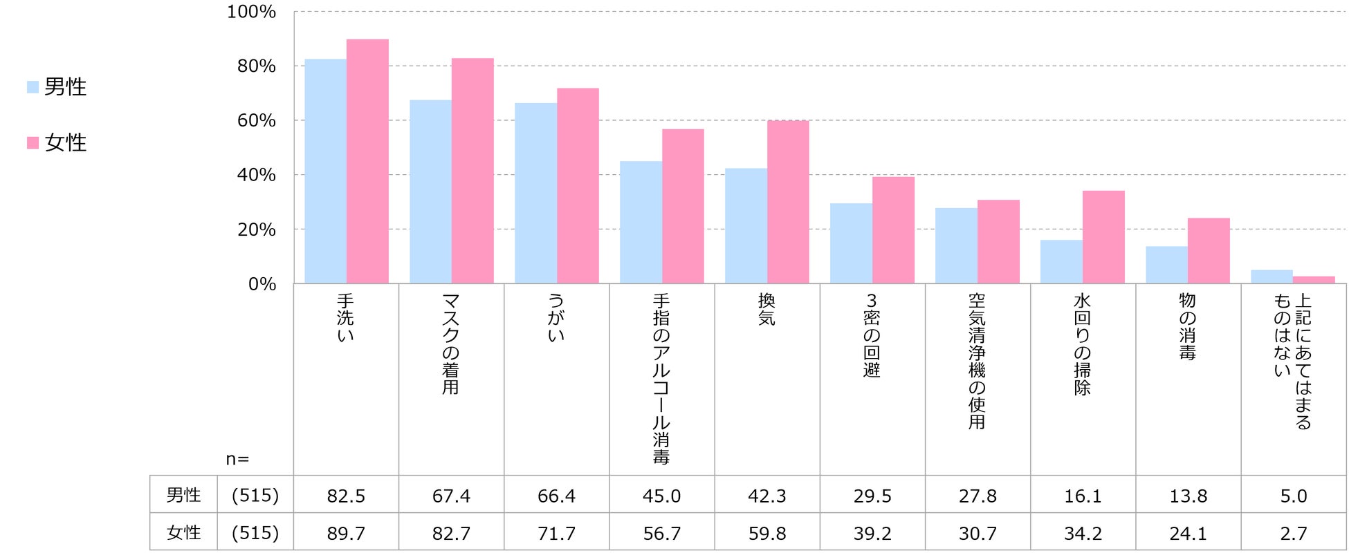 トップは、「手洗い」の男性82.5%、女性89.7%であった。
