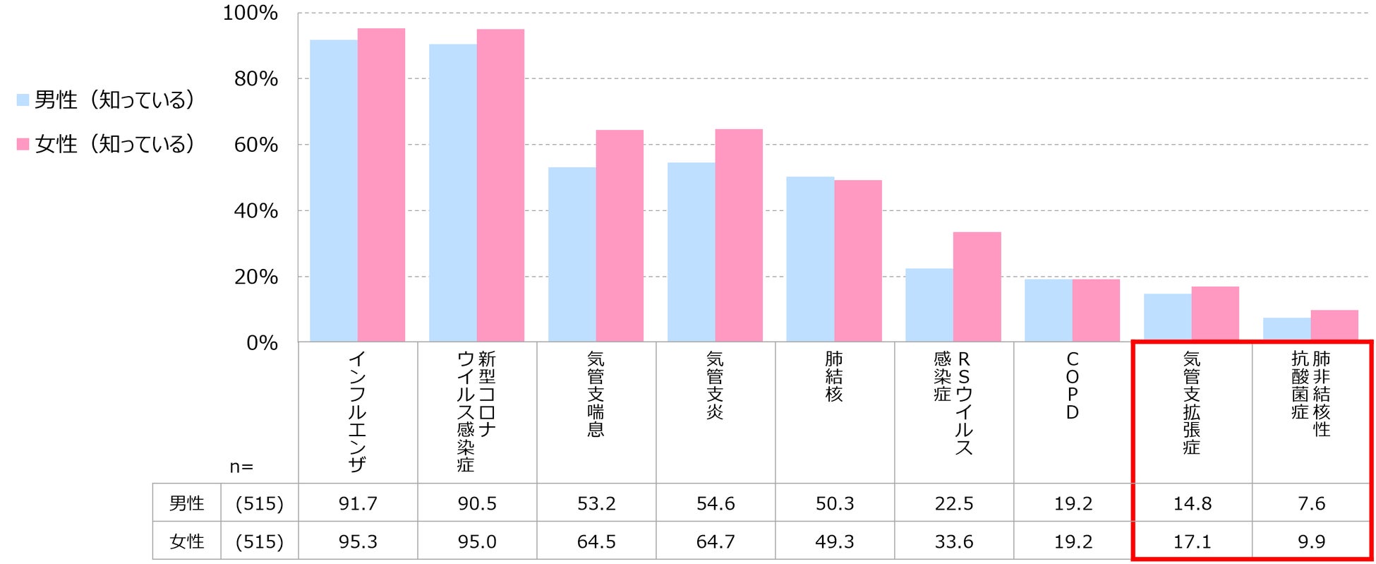 「インフルエンザ」と「新型コロナウィルス感染症」は、男女ともに9割以上の認知度(インフルエンザ:男性91.7%、女性95.3%、新型コロナウィルス感染症:男性90.5%、女性95.0%)であるのに対し、「肺NTM症」と「気管支拡張症」の認知度は低い(肺NTM症:男性7.6%、女性9.9%、気管支拡張症:男性14.8%、女性17.1%)。