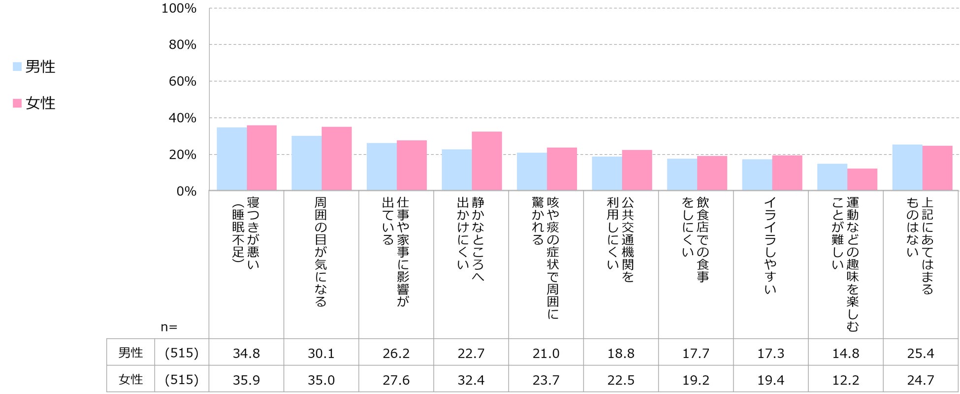 男女ともに、「寝つきが悪い(睡眠不足)」と「周囲の目が気になる」が3割を超えた。