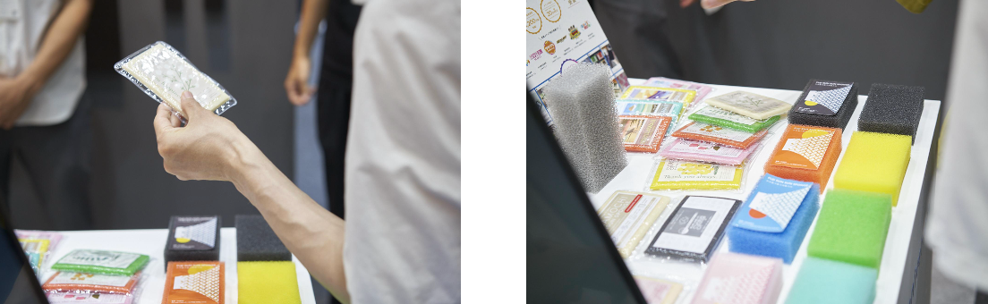 サンサンスポンジの圧縮パッケージは、嵩張らなくて送料を抑えることができるという点に加えて、そのコンパクトさに驚かれるお客様もいました。開発中の新製品のお披露目も実施し、国内外問わず多くのお客様から好評いただきました。