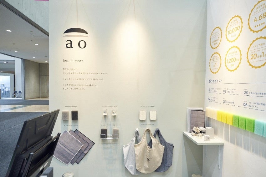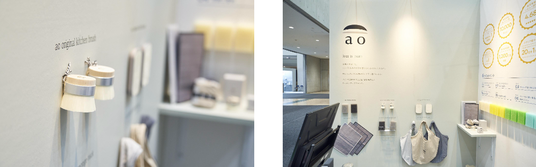 aoは、100%天然精油配合で柑橘系の香りがする食器用洗剤が注目を集めました。2種類の植毛を使用したブラシは手触りの良さが好評で、aoならではの世界観を楽しむ方が多くいました。