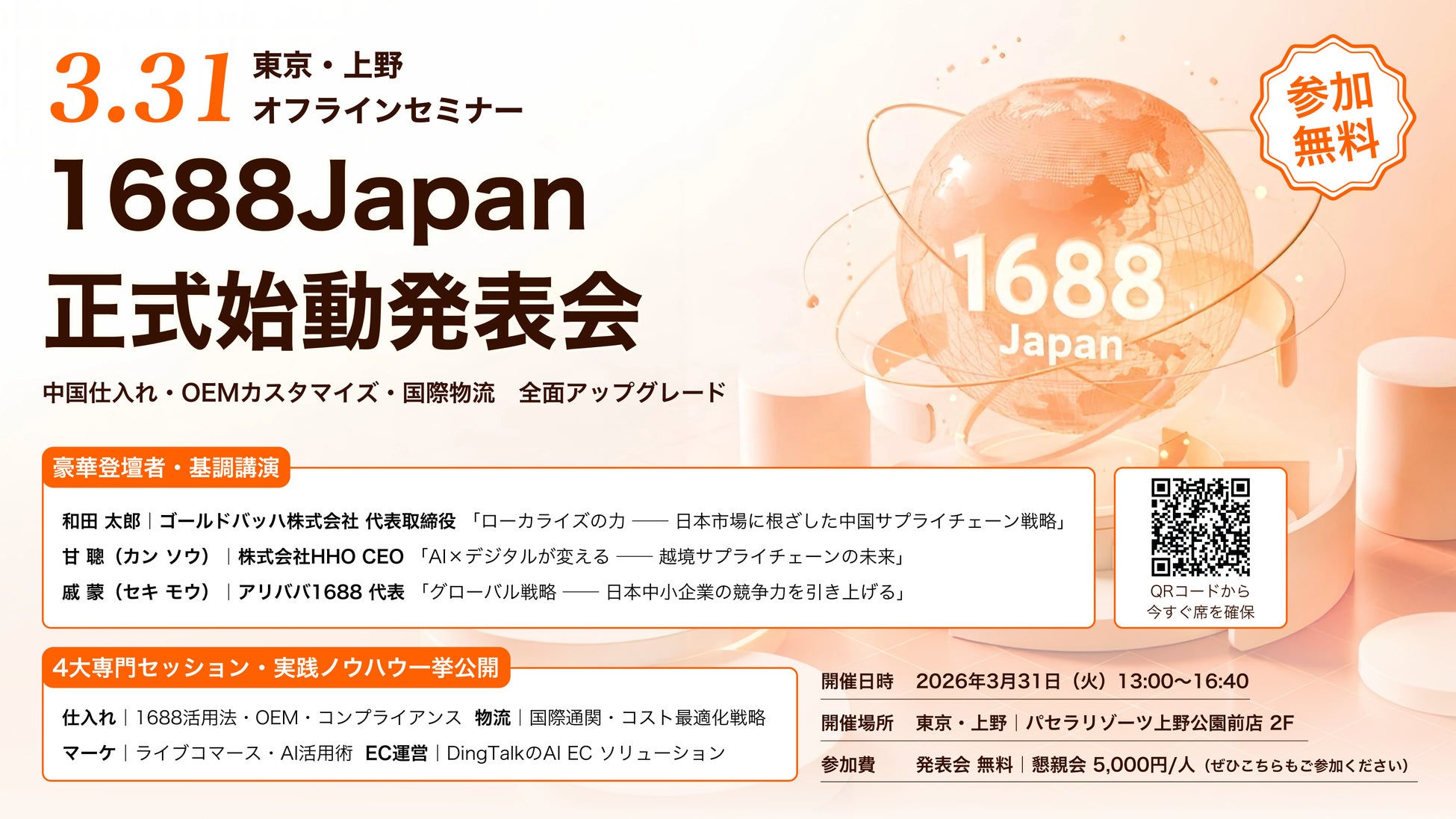 本セミナーは、1688Japan本格始動のお披露目の場であると同時に、越境ビジネスの最前線で得られるインサイトと実践的なソリューションを一度に入手できる機会です。アリババ1688の代表が直接登壇し、日本市場向けの戦略を語る場は極めて貴重であり、仕入れ・物流・マーケティング・EC運営の4領域を横断的にカバーする構成は、越境ビジネスの全体像を俯瞰するうえで最適なプログラムとなっています。