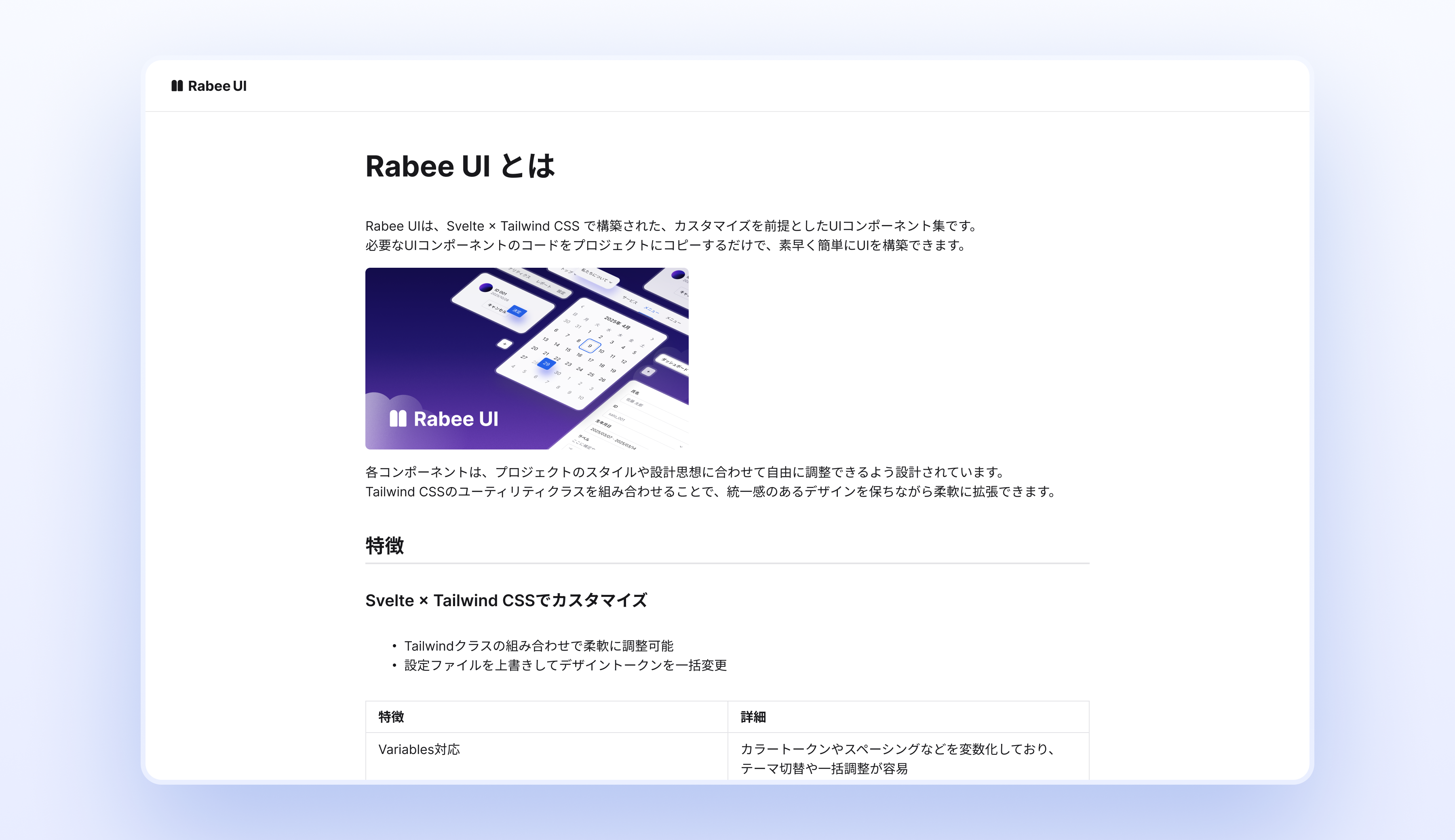 Rabee UIとは、SvelteとTailwind CSSで構築されたUIコンポーネント集であり、カスタマイズして使うことを前提とした「コンポーネントの種」です。プロダクトごとに色やフォント、アニメーションなどを自由にカスタマイズすることで、ブランドらしさを表現するデザインシステムを小さいコストで構築できます。