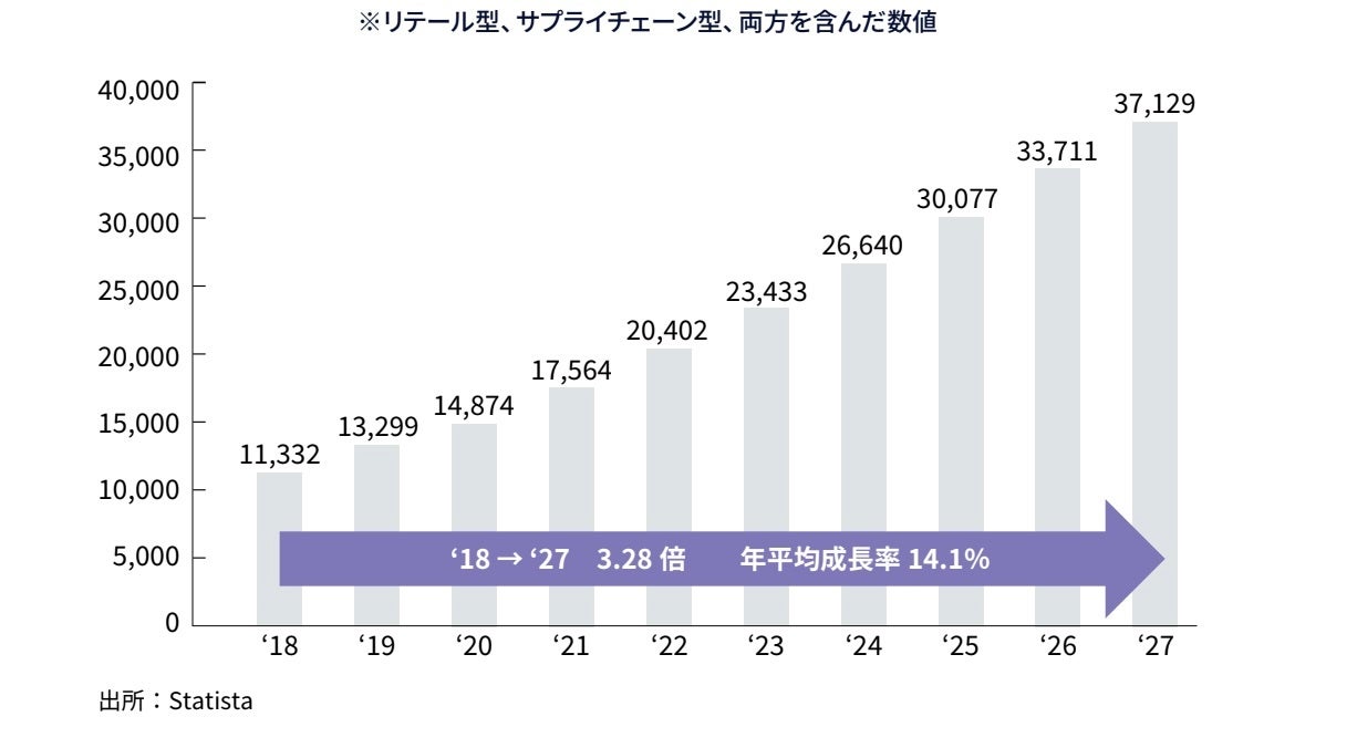 2024年の世界のBtoB-EC市場規模は、リテール型とサプライチェーン型を含めた推定値で26,640億米ドル(約1,300兆〜1,500兆円)に達すると予測されています。AI活用による需要予測や取引の自動化が進展。特に米国市場ではAIを用いたECプラットフォームが主流となりつつあります。