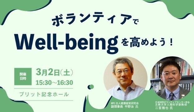 日ごろからボランティア活動に取り組む人は、そうでない人と比較して幸福度が高いという調査結果があります。ボランティア活動は私たちのWell-beingを向上させるの?そもそもWell-beingてどういう状態のこと?を、Well-beingの専門家、ボランティアの専門家が対談形式でお話しします。
