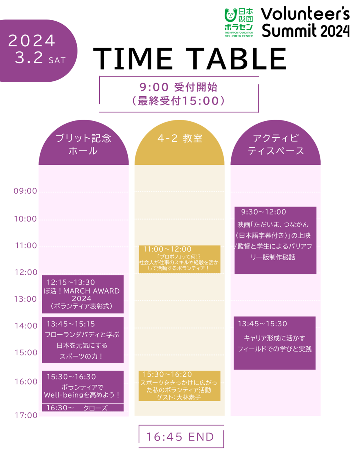 Volunteer’s Summitは、日本財団ボラセンが主催する、日本に新しいボランティアカルチャーをつくり、その輪を広げていくためのカンファレンス&アワードセレモニーです。聖心女子大学(東京都渋谷区)を会場に、スポーツ、プロボノなどボランティアに関する様々なテーマの講演や映画上映、2023年に積極的に活動した個人・団体へのボランティア表彰「ぼ活!MARACH AWARD 2024」の表彰式を行います。