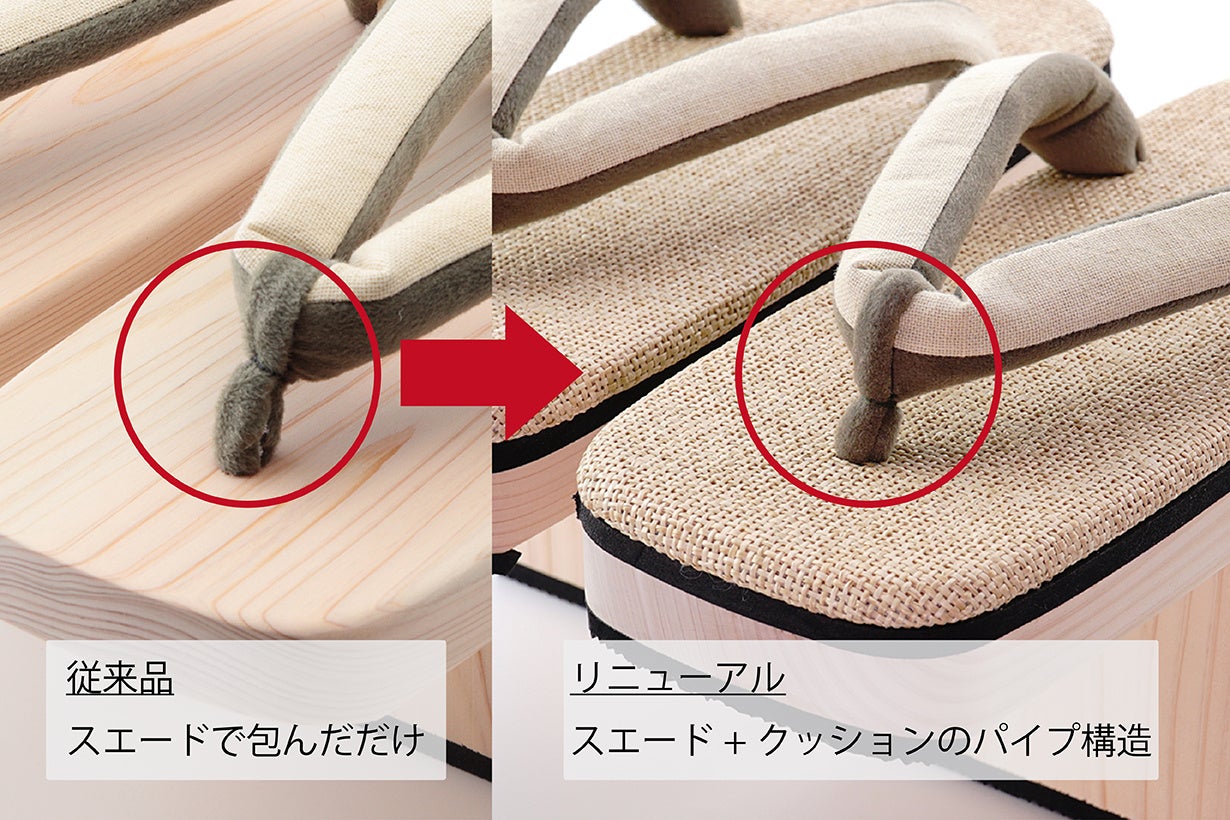 足指で挟む前坪(まえつぼ)は、従来品では芯縄をスエード生地で包むだけでしたが、今回はスエード生地にクッション材を貼り、さらにパイプ状にした中に芯縄を通すことで、クッション性が向上し足指が痛くなりにくい構造になりました。
