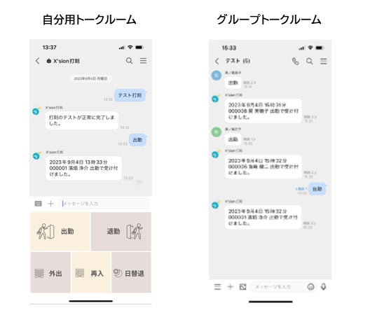 「LINE WORKS」のトークルームで「出勤」「退勤」「外出」「再入」「日替退」の打刻が可能。