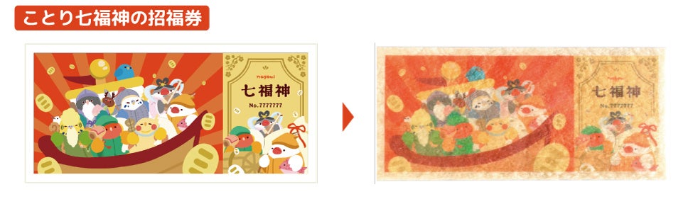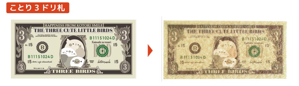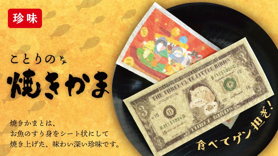 今秋新発売の「焼きかま」は魚のすり身をシート状にし、焼き上げた珍味です。噛めば噛むほど旨味が出る、おつまみとして馴染み深い商品です。大人のおつまみだけでなく、子どものおやつにもオススメです。七福神とドル紙幣を模した小鳥のイラストがプリントされており、「ことり七福神の招福券」はインコや文鳥たちが扮する七福神のご利益で幸運を招くように、「ことり3ドリ札」は“3羽の鳥”と“3ドル”をかけて金運UPできるように願いを込めて作られました。