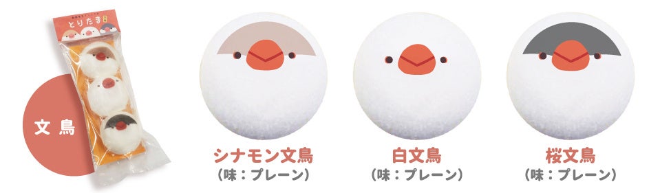 弊社では「とりたま」の9個入りが定番商品になっており、この度お手頃サイズとして3個入り商品を発売いたします。「とりたま(3個入り)文鳥」はシナモン文鳥、白文鳥、桜文鳥の絵柄が入っており、「とりたま(3個入り)インコ」はセキセイインコ(ブルー&グリーン)とオカメインコの絵柄が入っております。まん丸なフォルムが可愛らしい商品です。