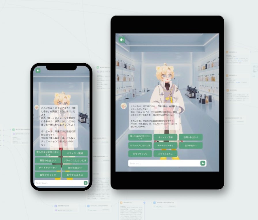 支援内容:オリジナルキャラと対話しながら推しをイメージした「推し香水」を調香してくれるAIコンシェルジュアプリ開発