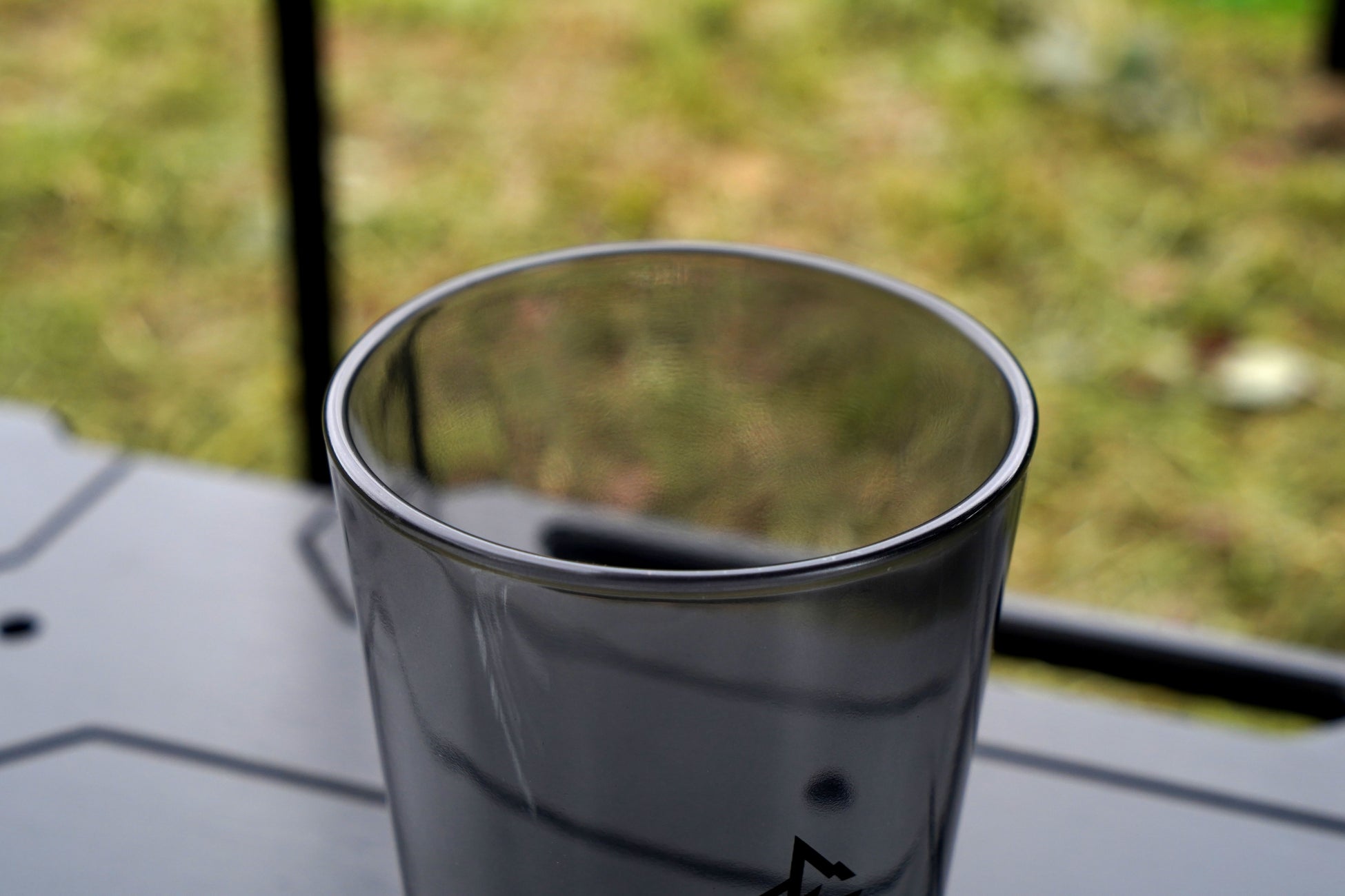 キャンプで飲む一杯を特別に変える、黒いパイントグラスがここにあります。