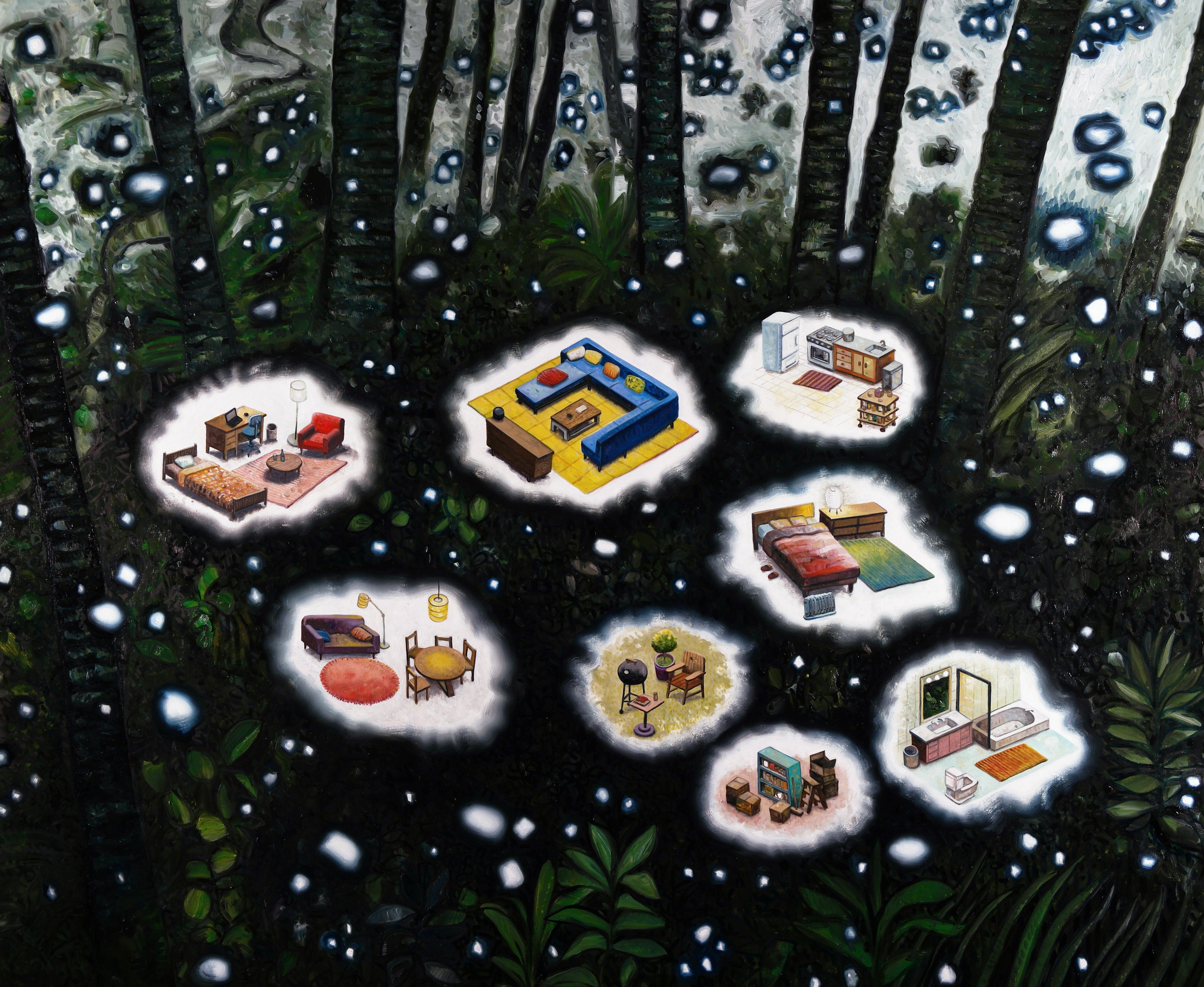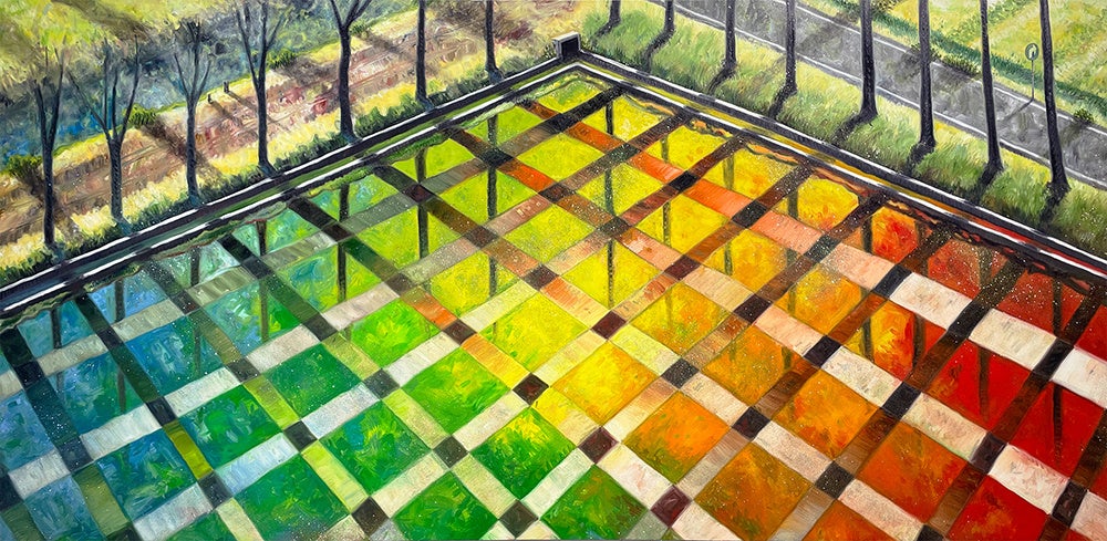 建築と都市計画を学んだ大岩にとって、風景は単なる背景ではありません。彼が描く一見見慣れた光景には微細な歪みが潜み、自然と建築、現実と想像が滑らかに交差していきます。