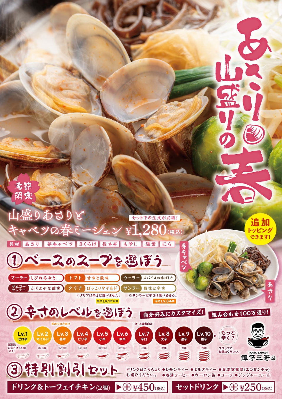 寒い冬を乗り越え間もなく訪れる春は“潮干狩り”の季節。これから産卵期を前に身入りがよくなり、あさりの旨みが増すこの季節に、タムジャイサムゴーから、旬のあさりをたっぷりと盛り込んだ季節限定メニュー「山盛りあさりとキャベツの春ミーシェン」を販売することとなりました。具材はあさり・甘味がたっぷりの芽キャベツ・きくらげ・長ネギに加え、にら・もやし・湯葉が盛り込まれており、スープはお好みに合わせて6種類からお選びいただけます。あさりの旨みとタムジャイサムゴ―のスパイスが絡み合ったスープが冬の寒さで甘味を増した旬の芽キャベツにたっぷりと染み込み、春の美味しさをご堪能いただける一杯になりました。さらに「特別割引セット」のご注文でドリンクや、一度食べたらやみつきになると人気の「トーフェイチキン」もお得にお楽しみいただけます。