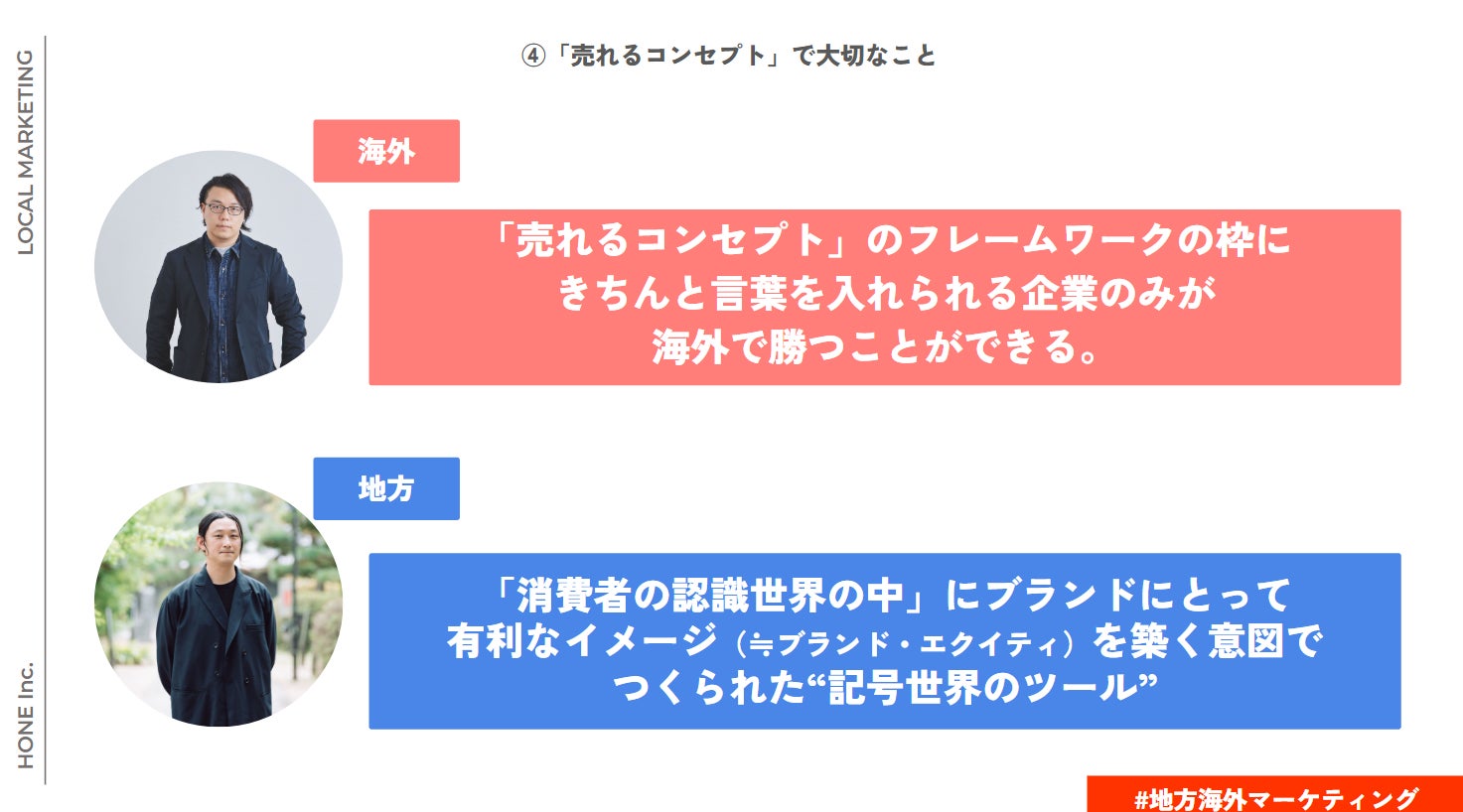 マーケティングにおける成功の鍵は、「売れるコンセプト」を見つけ、それを正確に言語化することにあります。徳田氏は、越境ECプロジェクトで用いられる「コンセプト設計フレームワーク」を紹介しました。ユーザーの潜在ニーズ、文化的背景、商品特性を踏まえた上で、明確かつ感情に響くコンセプトを打ち出す重要性を語りました。桜井氏は、「ブランド・エクイティ」を形成する“記号の世界”として、ネーミング・デザイン・キャッチコピーなどのツールの活用が地方ビジネスの成否を左右すると言及しました。「消費者の認識世界の中で、有利なポジションを取るための言語化」がコンセプト設計のゴールだと強調しました。