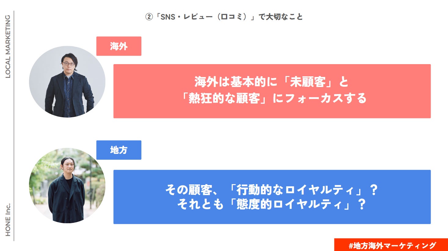 SNSやレビュー(口コミ)は、現代マーケティングにおいて「顧客の本音」を知る最も重要な情報源の一つです。徳田氏は、アパレルブランド「The Strike Gold」の海外展開事例を紹介しました。「未顧客」と「熱狂的なファン」の両者にヒアリングを実施することで、その差分を埋める施策を展開し、CV率(購入率)の大幅な向上に成功したと説明しました。桜井氏は、顧客ロイヤルティの4分類(態度的ロイヤルティ/行動的ロイヤルティ)を紹介しました。地方では「繰り返し購入しているから」といって必ずしもロイヤルユーザーとは限らず、ロイヤルティの種類を理解した上で、どう関係性を深めるかがポイントになると述べました。