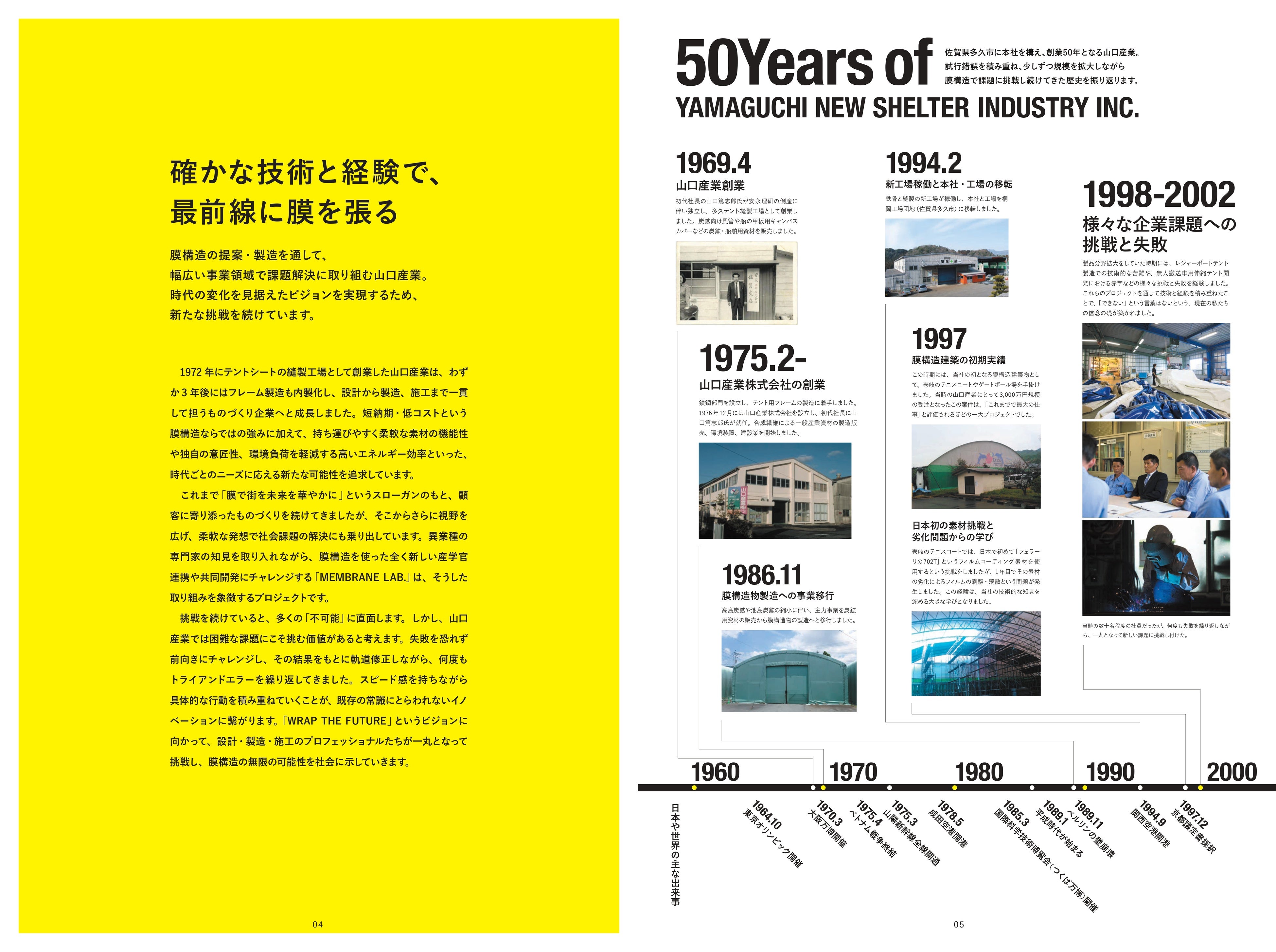 50Years of YAMAGUCHI NEW SHELTER INDUSTRY INC.: 佐賀県多久市に本社を構え、創業50年となる山口産業。試行錯誤を積み重ね、少しずつ規模を拡大しながら膜構造で課題に挑戦し続けてきた歴史を振り返ります。