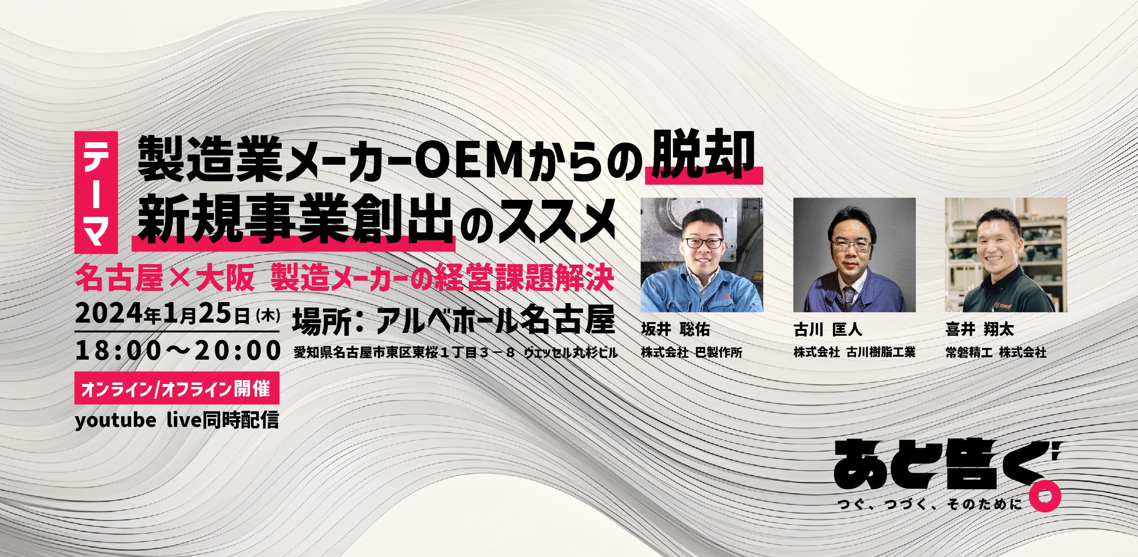 第3回はBtoB向け製造業メーカーが抱える課題に対し、自社リソースを活用し事業者のありたい姿の実現にむけて新規事業創出を行っていく背景にフォーカス。日本の製造業ランキングトップの名古屋地域企業と東大阪の企業によるミートアップイベント。デザイン経営をきっかけに交流や情報交換を高める為、東西で取り組む新規事業創出についての軌跡と苦悩を語り合います。