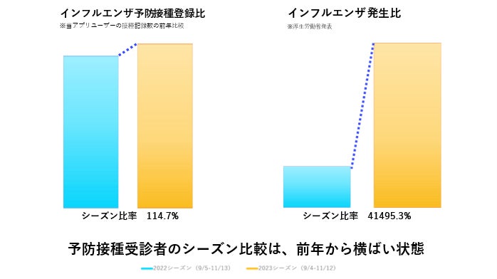 一方で、インフルエンザの予防接種の記録実績については、予防接種記録前年比114.7%と上昇傾向にはあるものの、インフルエンザの発生数と比較すると、予防接種受診者は前年から横ばい状態と言えます。