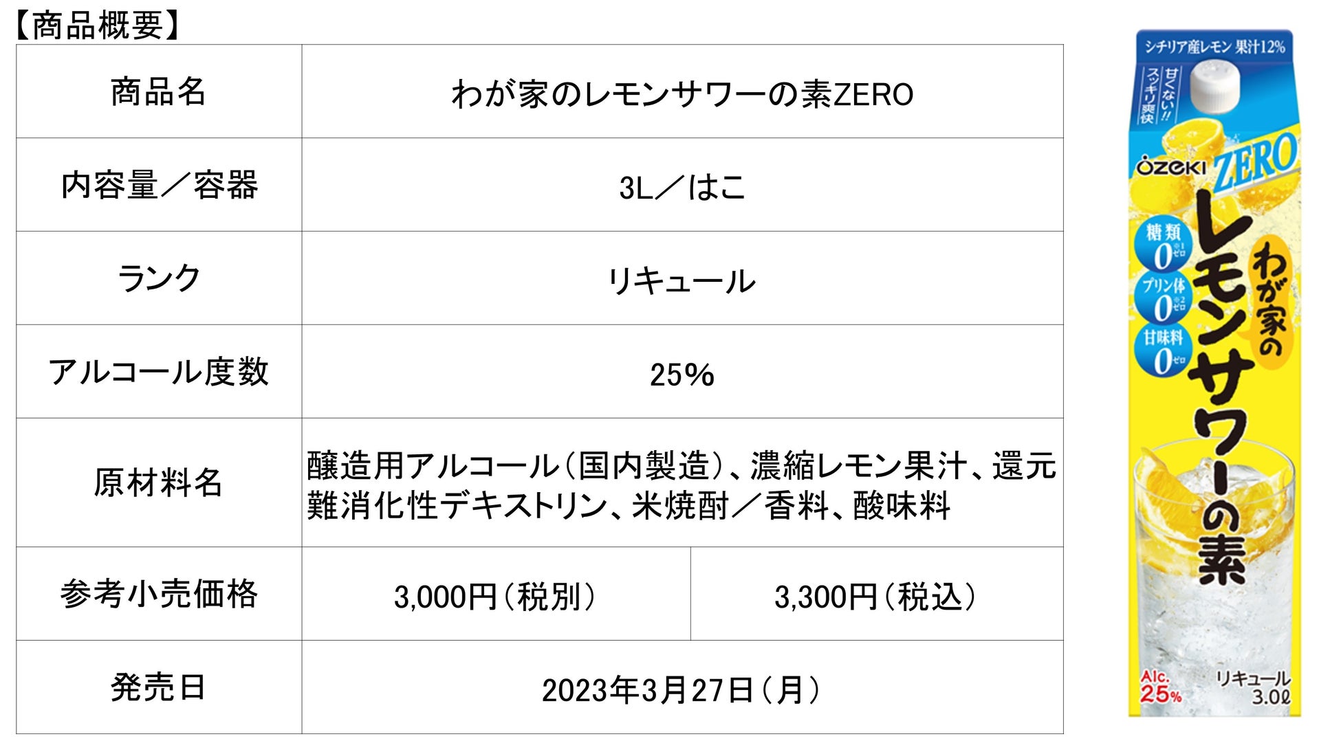 大関株式会社(社長:長部訓子/兵庫県西宮市)は、手軽に本格的なサワーが楽しめるとご好評をいただいております「わが家のサワーの素」シリーズから、大変お得な大容量サイズ「わが家のレモンサワーの素ZERO3Lはこ詰」を2023年3月27日(月)から新発売します。
